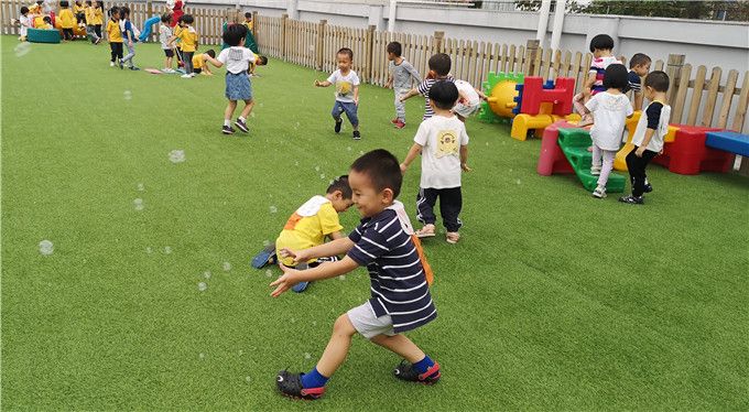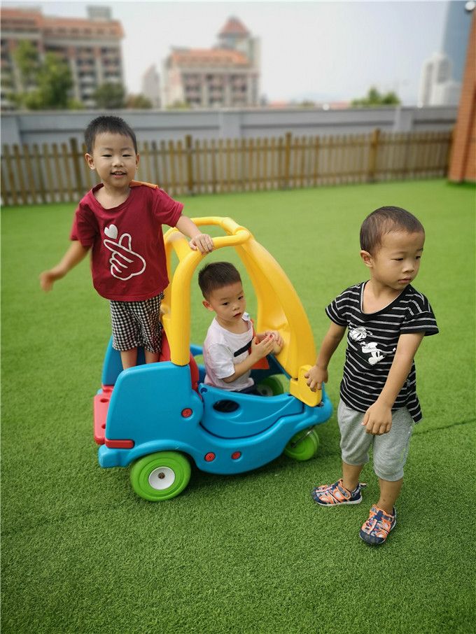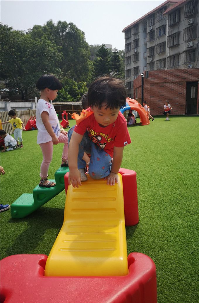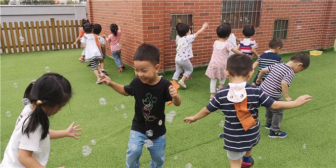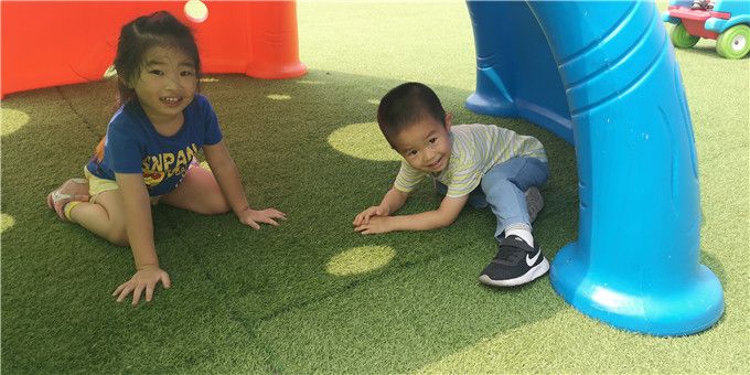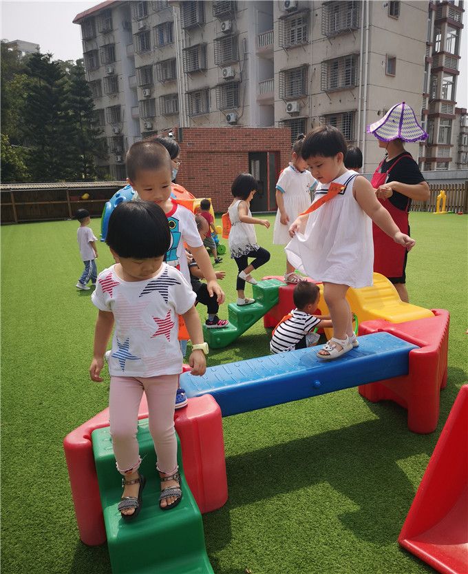 天台户外,我们和老师们玩起吹泡泡的游戏;自选玩具,我们学当小司机到处送货,忙得不亦乐乎;学小兔跳、玩钻山洞、走独木桥,可一点都没难倒我们。