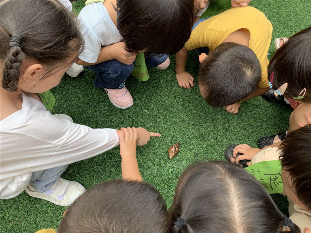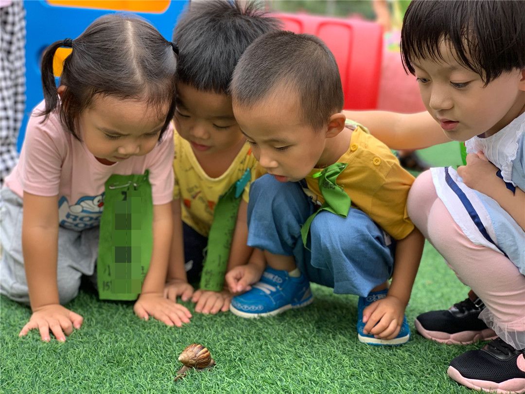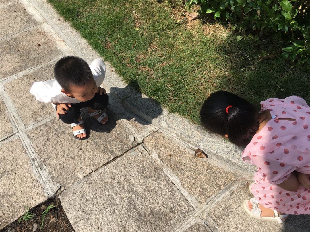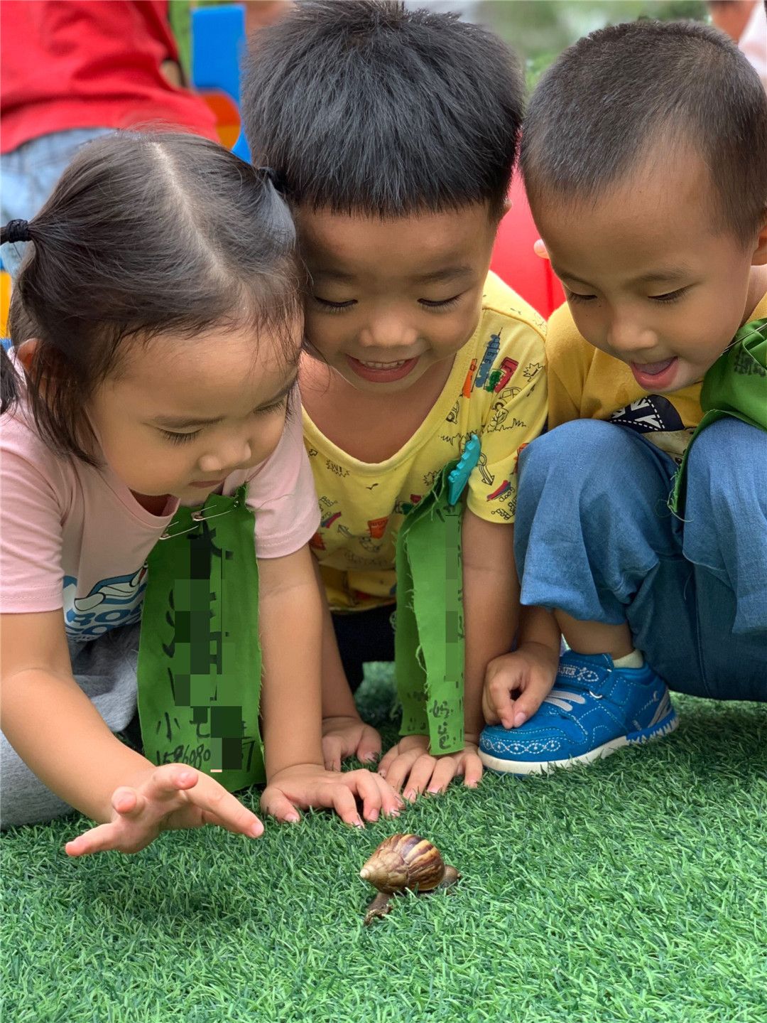 户外活动时,几个萌娃发现了草丛里的蜗牛,有的萌娃想用手去摸小蜗牛的触角,有的萌娃试着去摸蜗牛的壳……