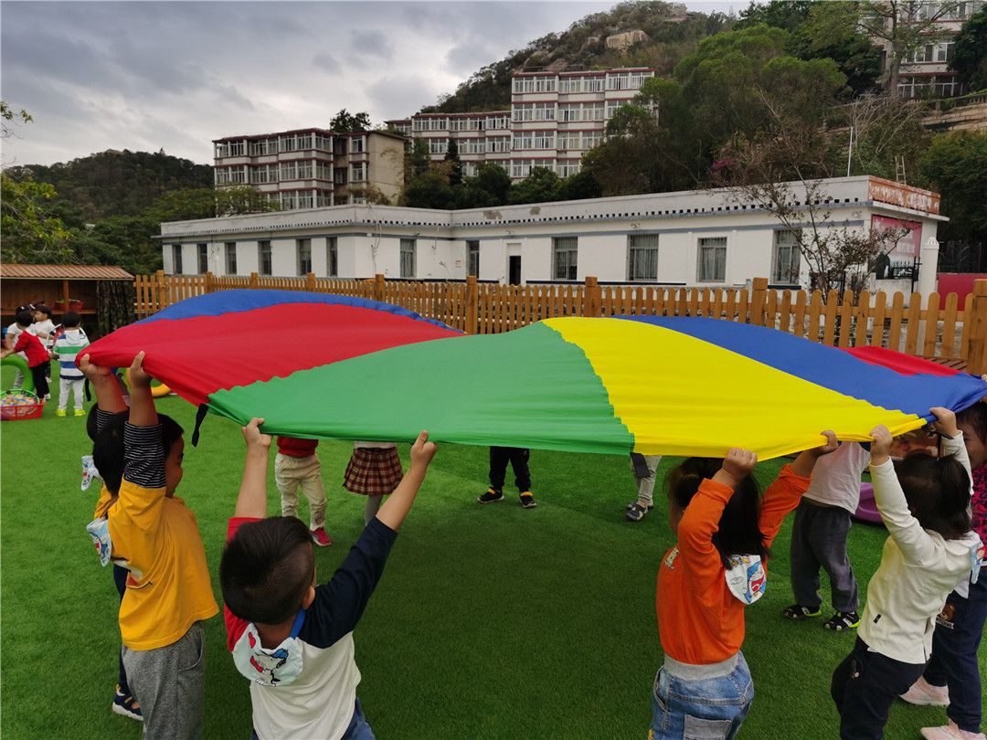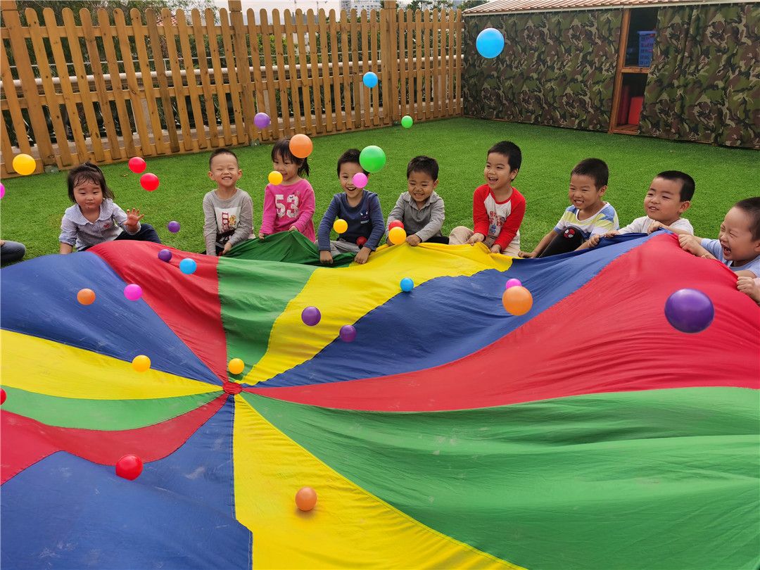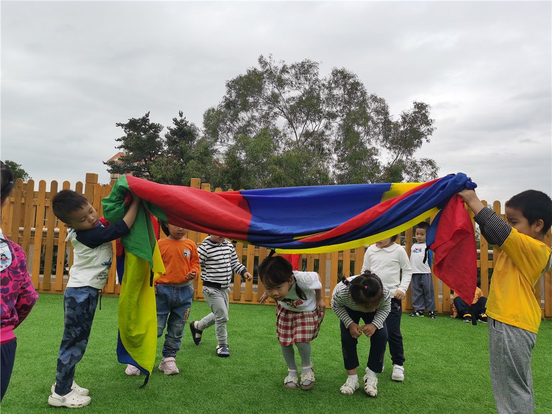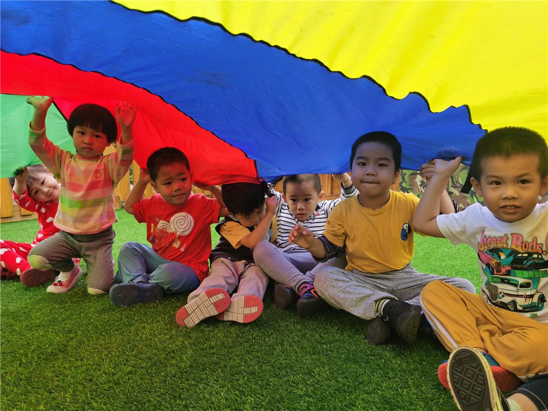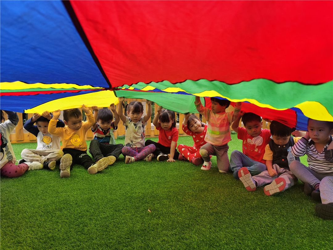 “一二三起,一二三放”跟着老师的口令做起来,都要抓紧一点哦,用点力气,彩虹伞变成彩色城堡。