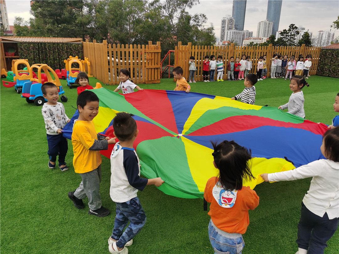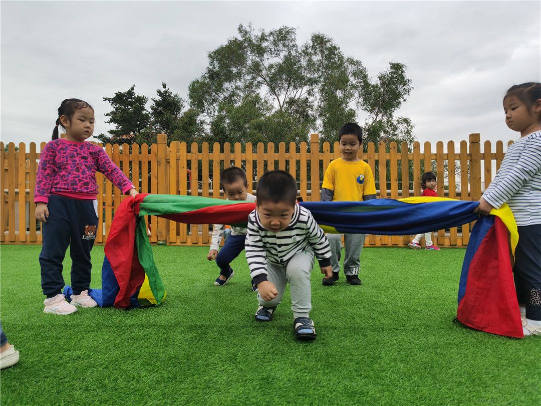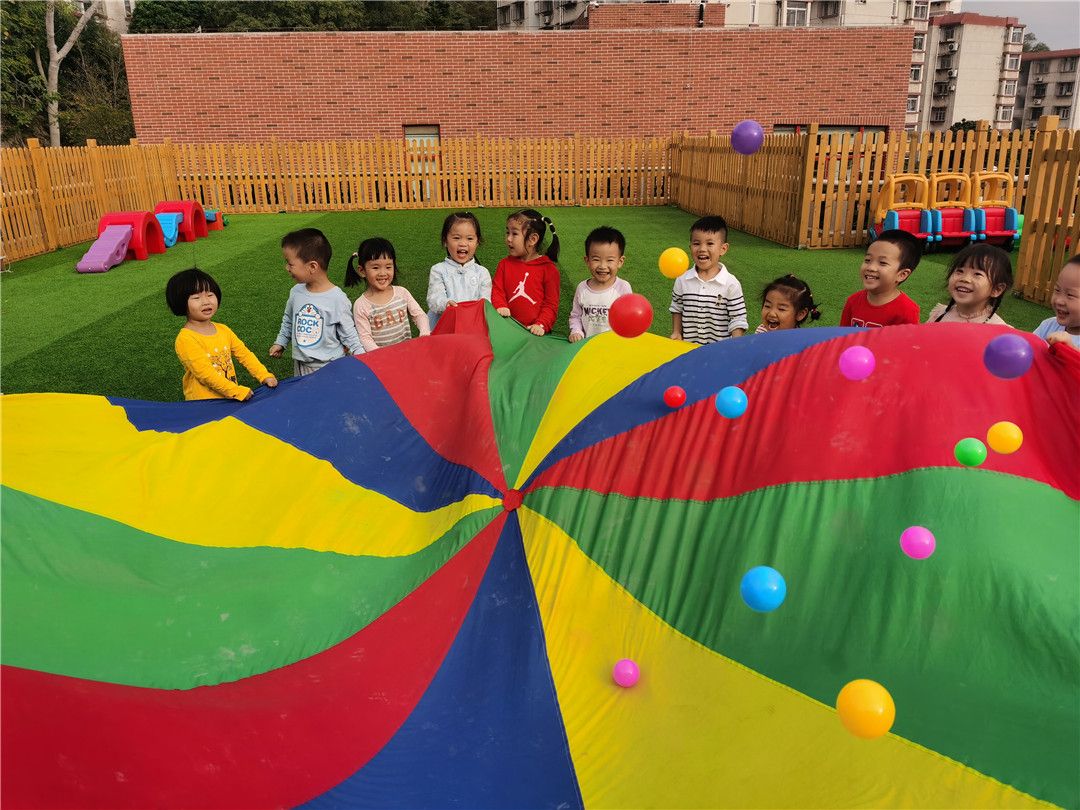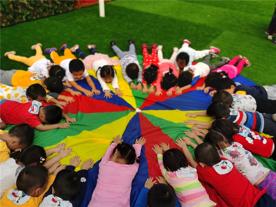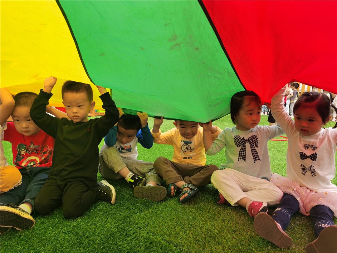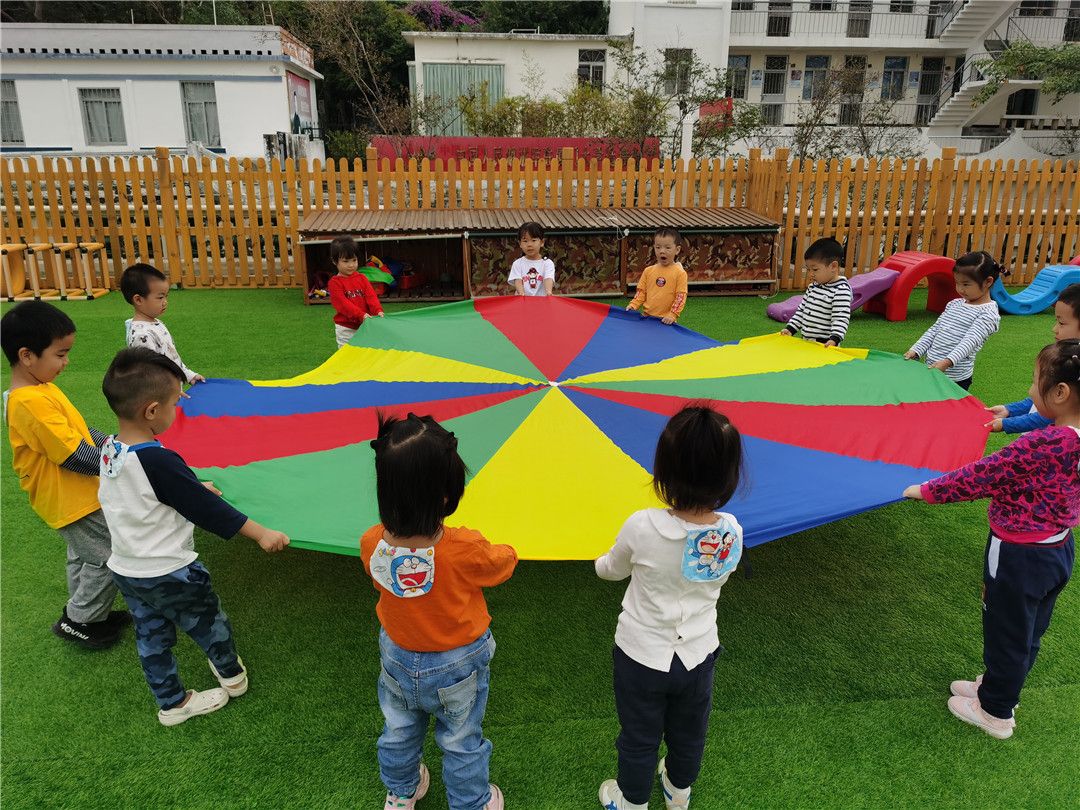 “一二三起,一二三放”跟着老师的口令做起来,都要抓紧一点哦,用点力气,彩虹伞变成彩色城堡。