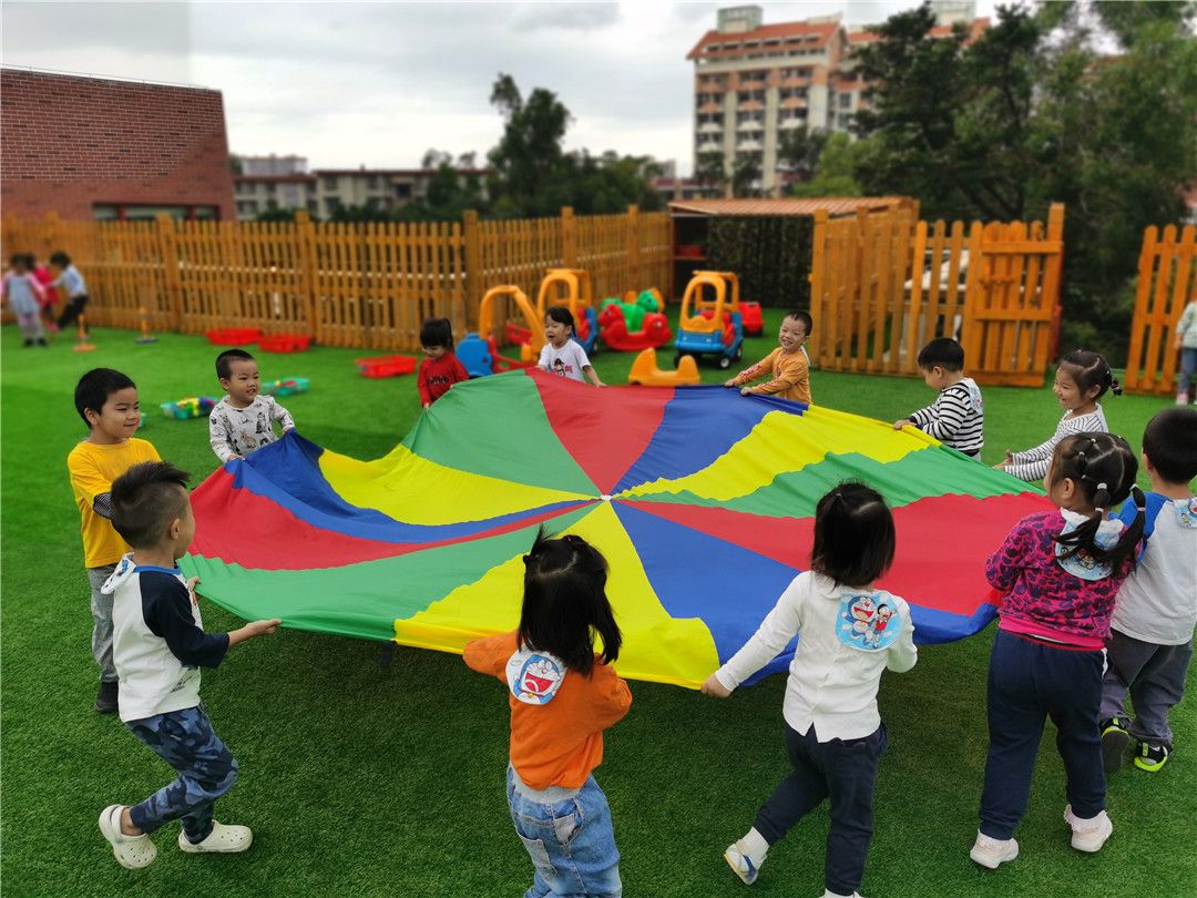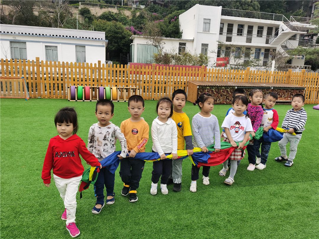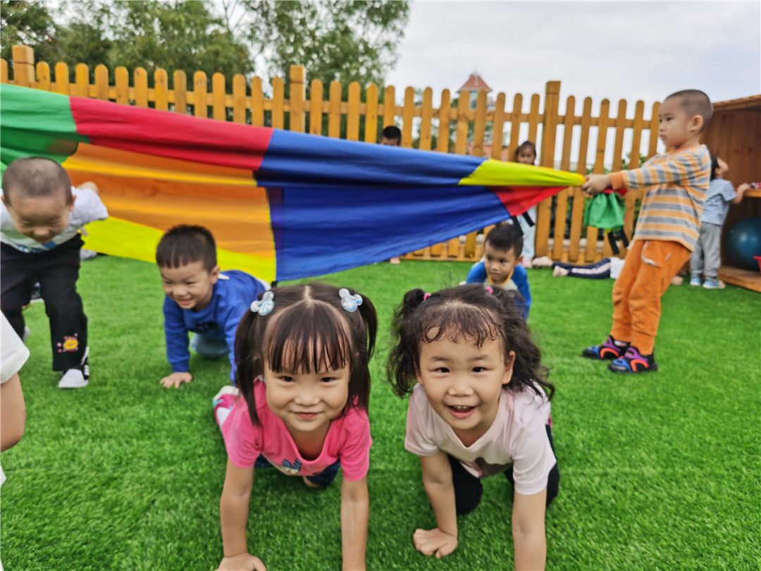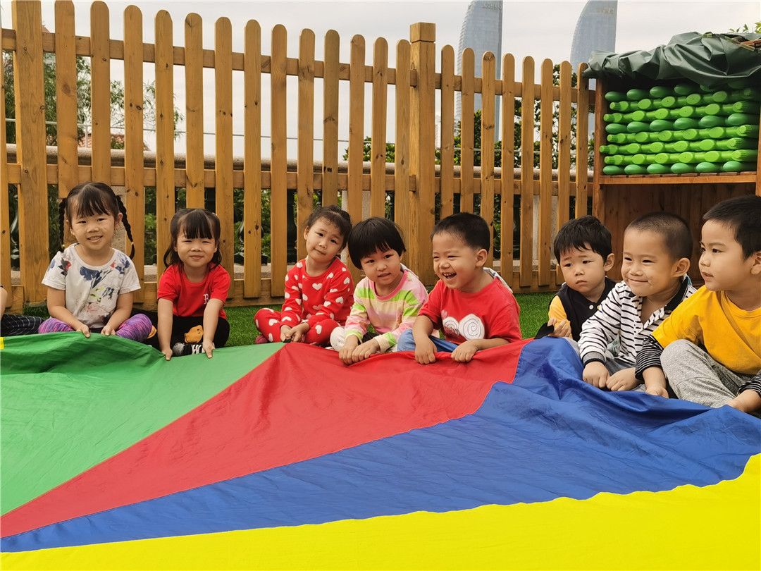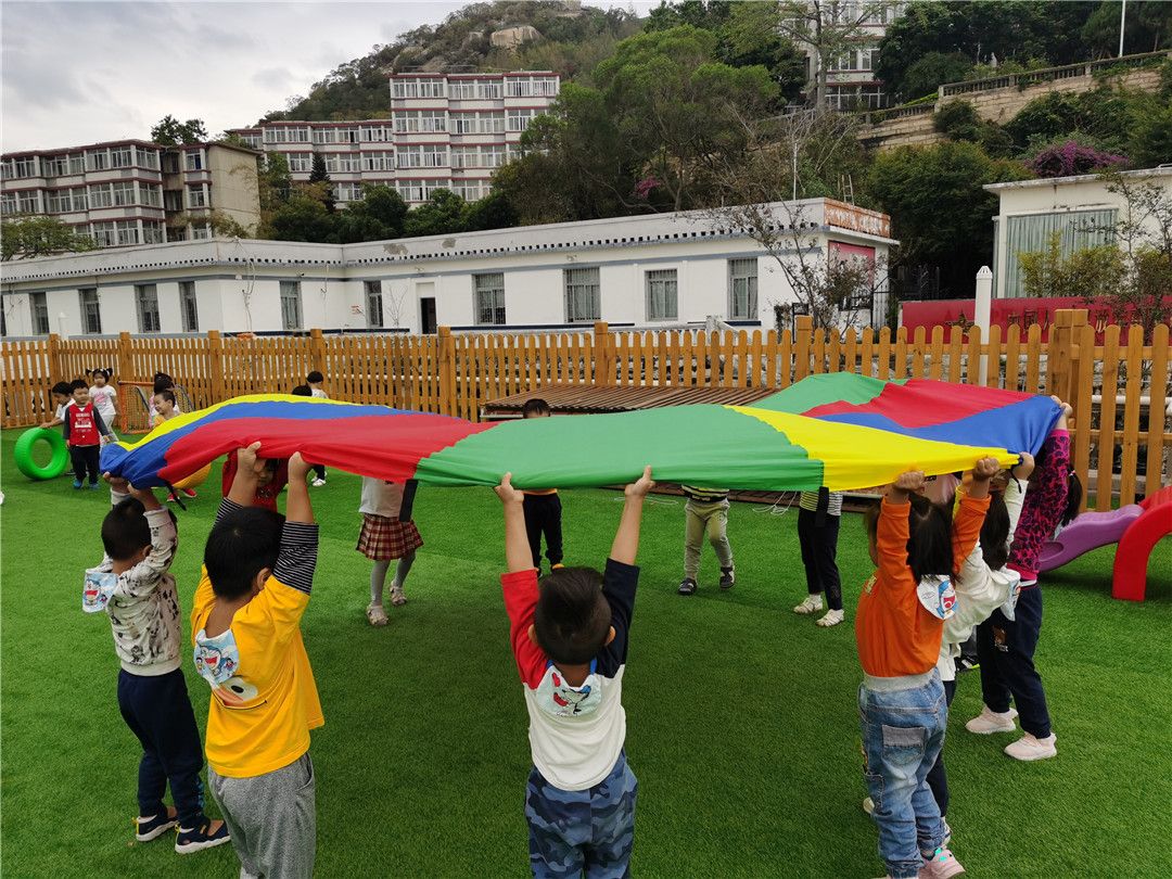 “一二三起,一二三放”跟着老师的口令做起来,都要抓紧一点哦,用点力气,彩虹伞变成彩色城堡。