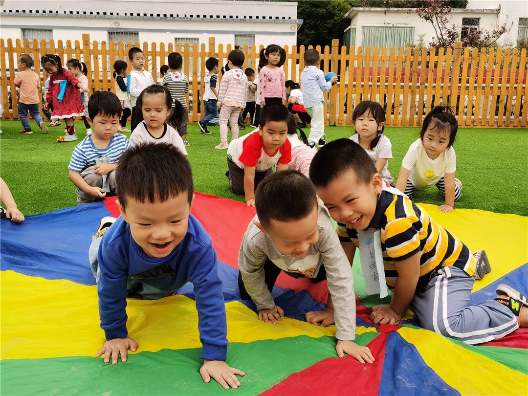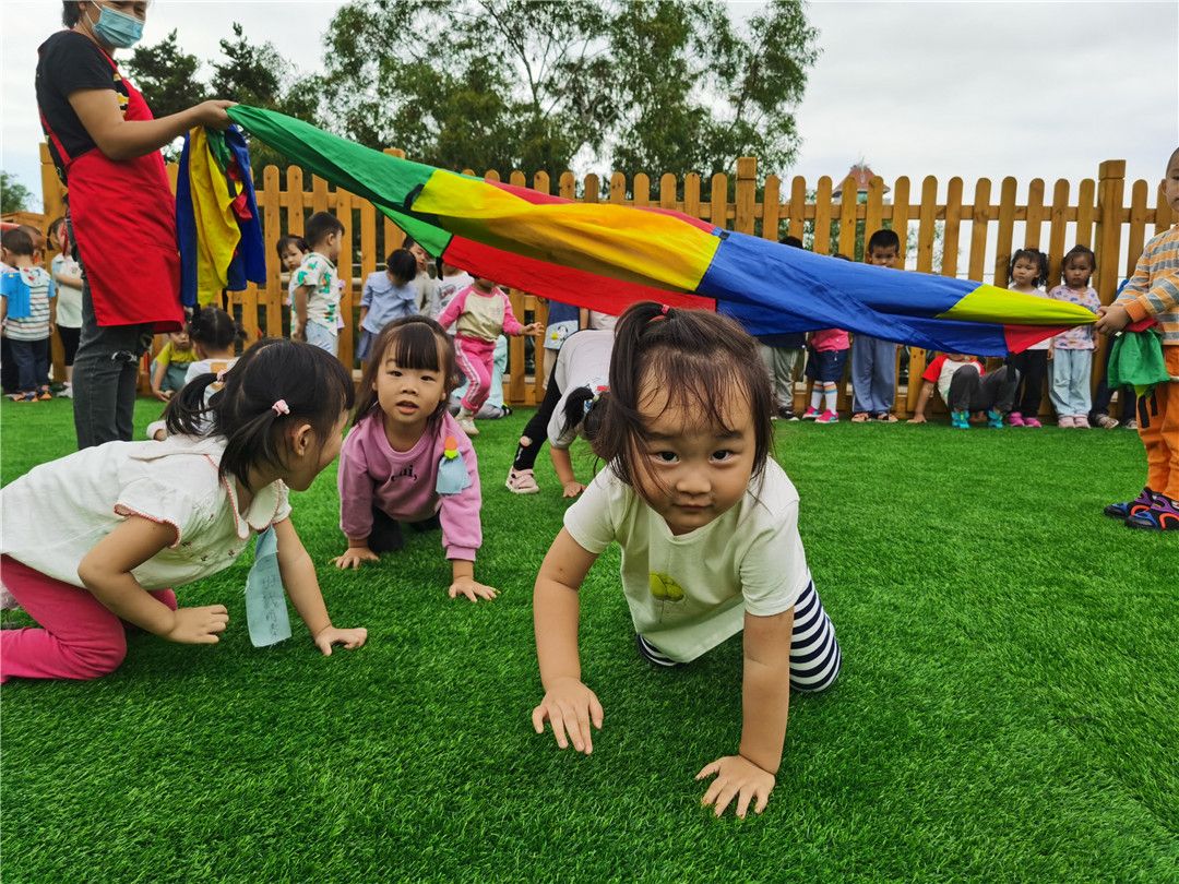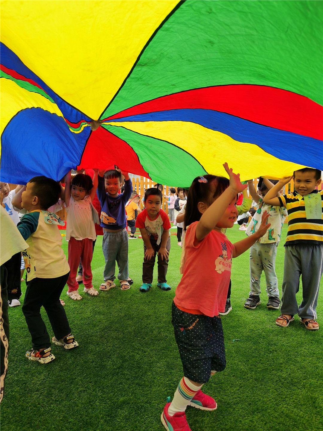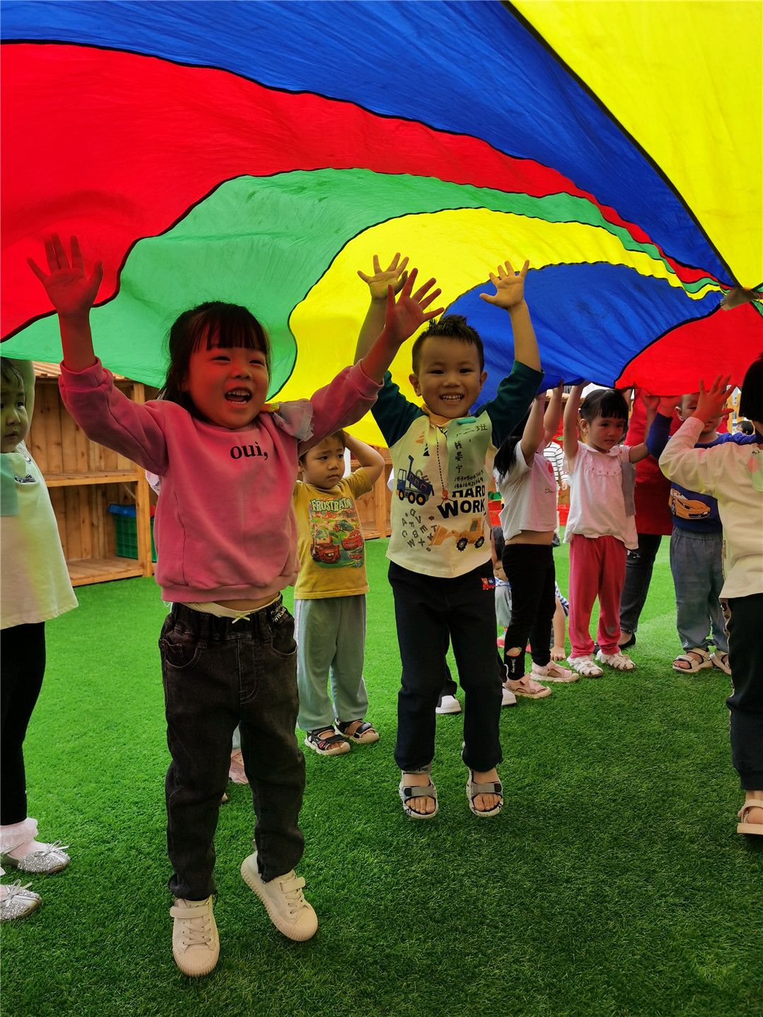彩虹伞的玩法千变万化,孩子们就这样尽情地跳伞、转伞、抓伞,操场上欢呼声、惊叫声, 汇成了欢乐的海洋!他们热情迸发, 笑容绽放,时而爬 , 时而跳……一个个挑战动作,一个个创意游戏,让他们玩出了健康、玩出了童趣!让我们一起用游戏点亮孩子的七彩童年!让每个游戏都成为孩子们心中那一抹永不褪色的彩虹。