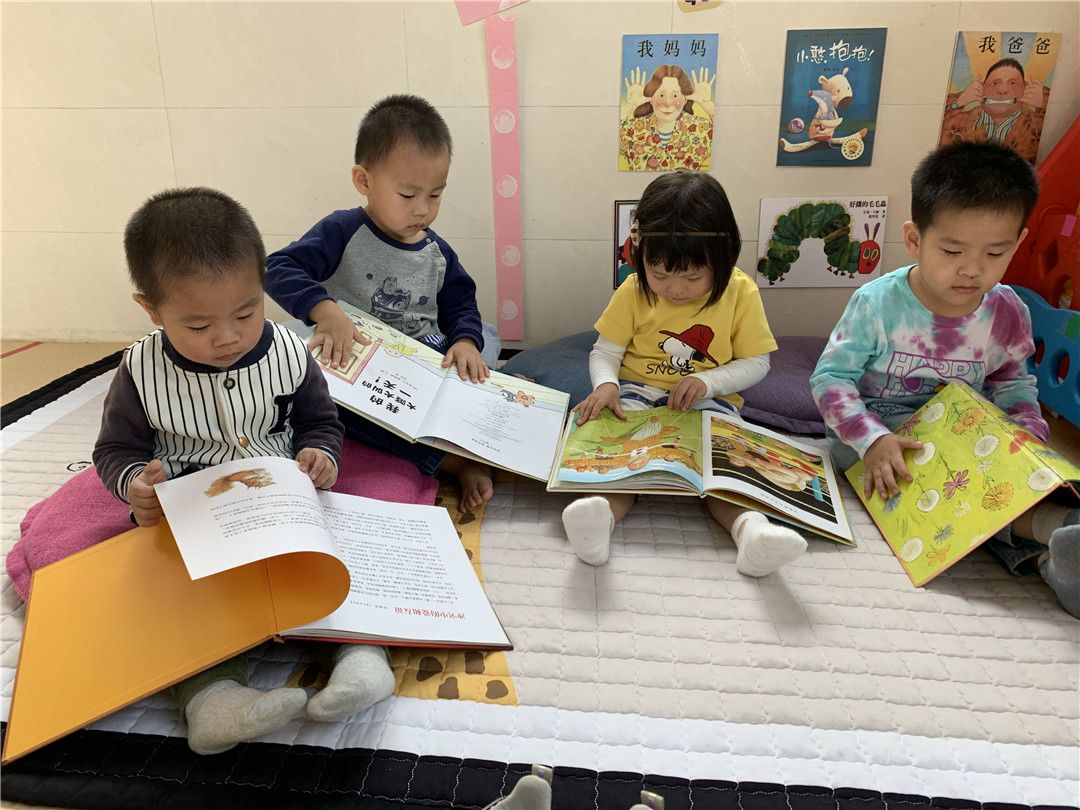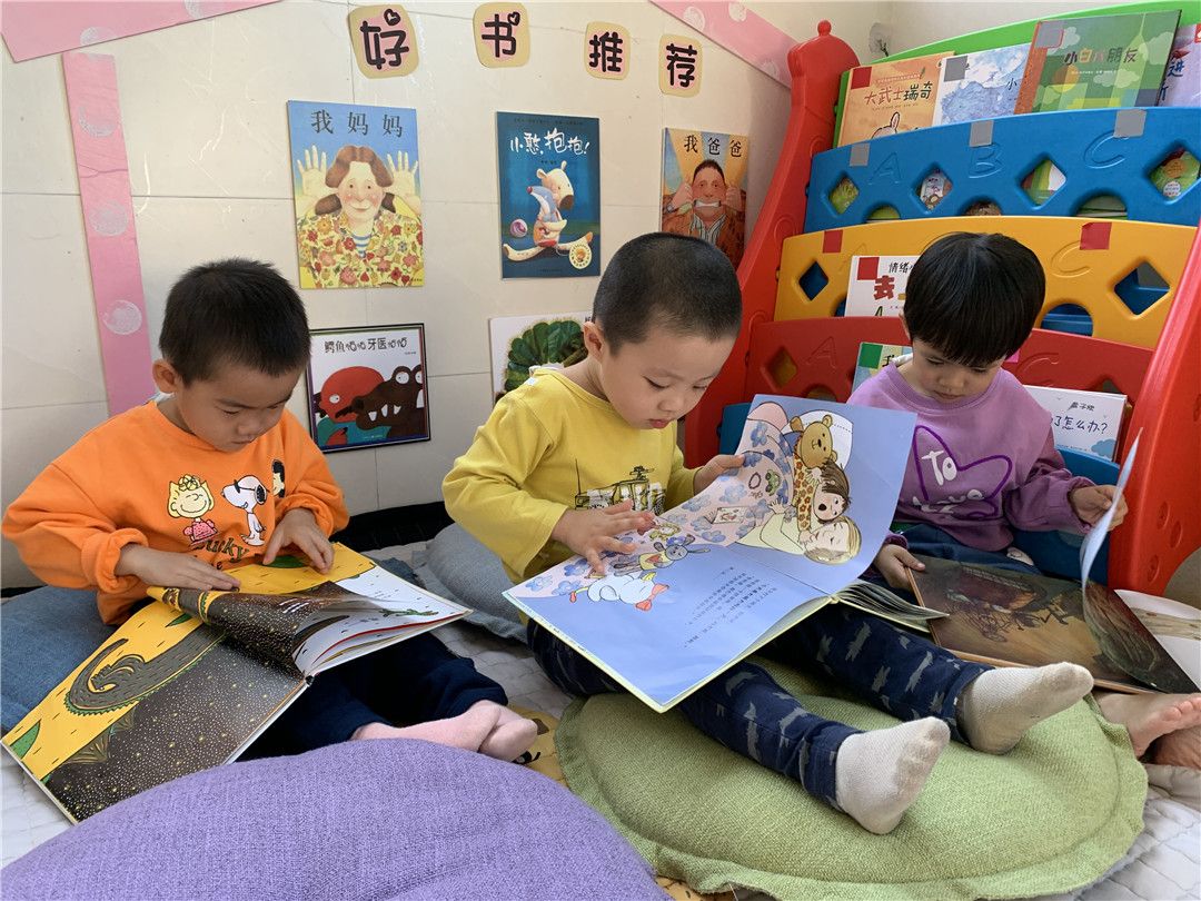温馨的阅读区,我们翻看着喜欢的绘本,《肚子里有个火车站》是我最喜欢的书。我们爱阅读!