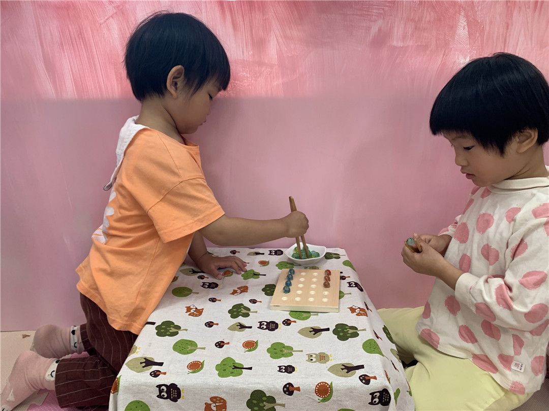 我们一起来比赛,看谁先夹完小盘子里的弹珠。