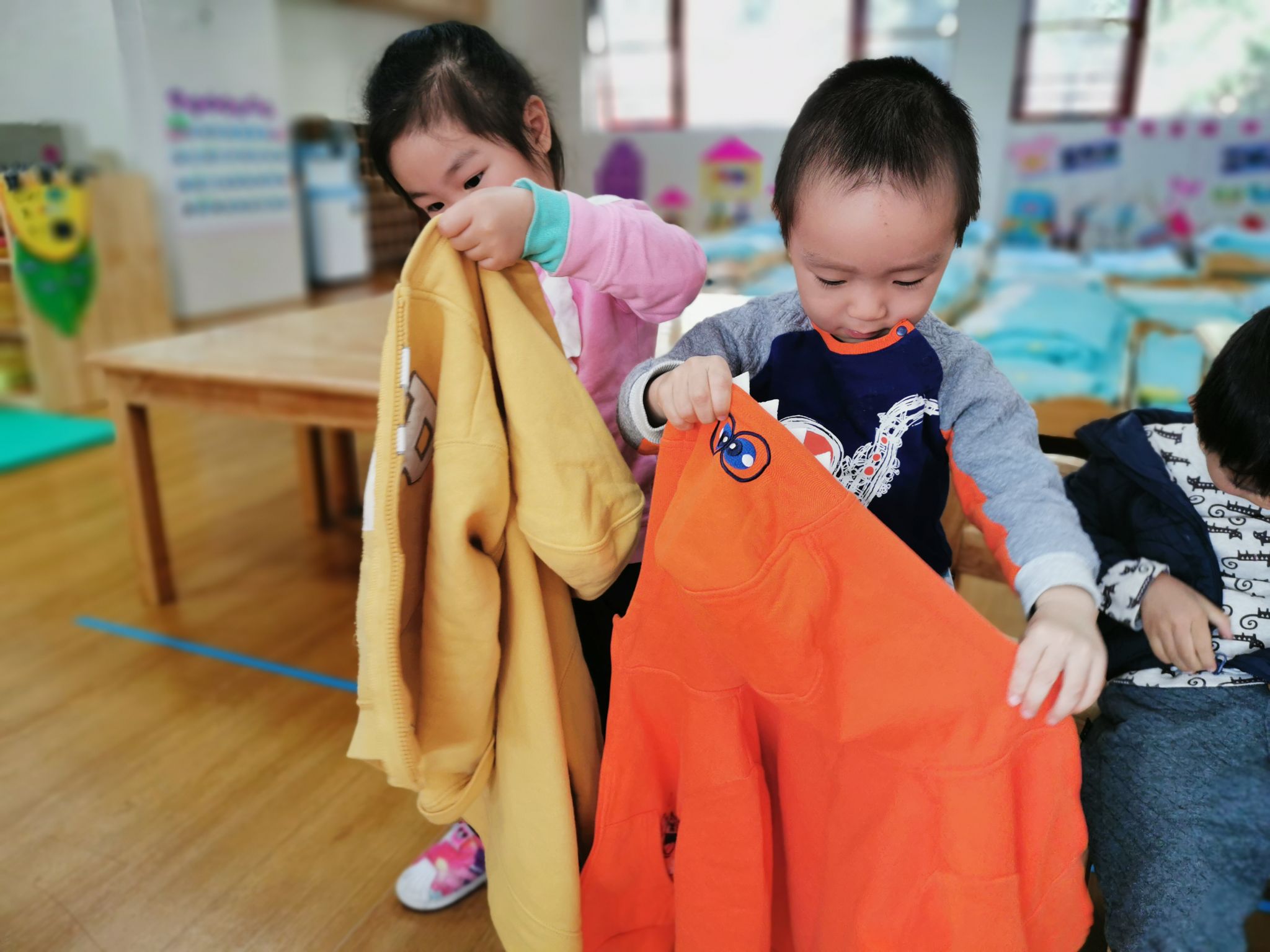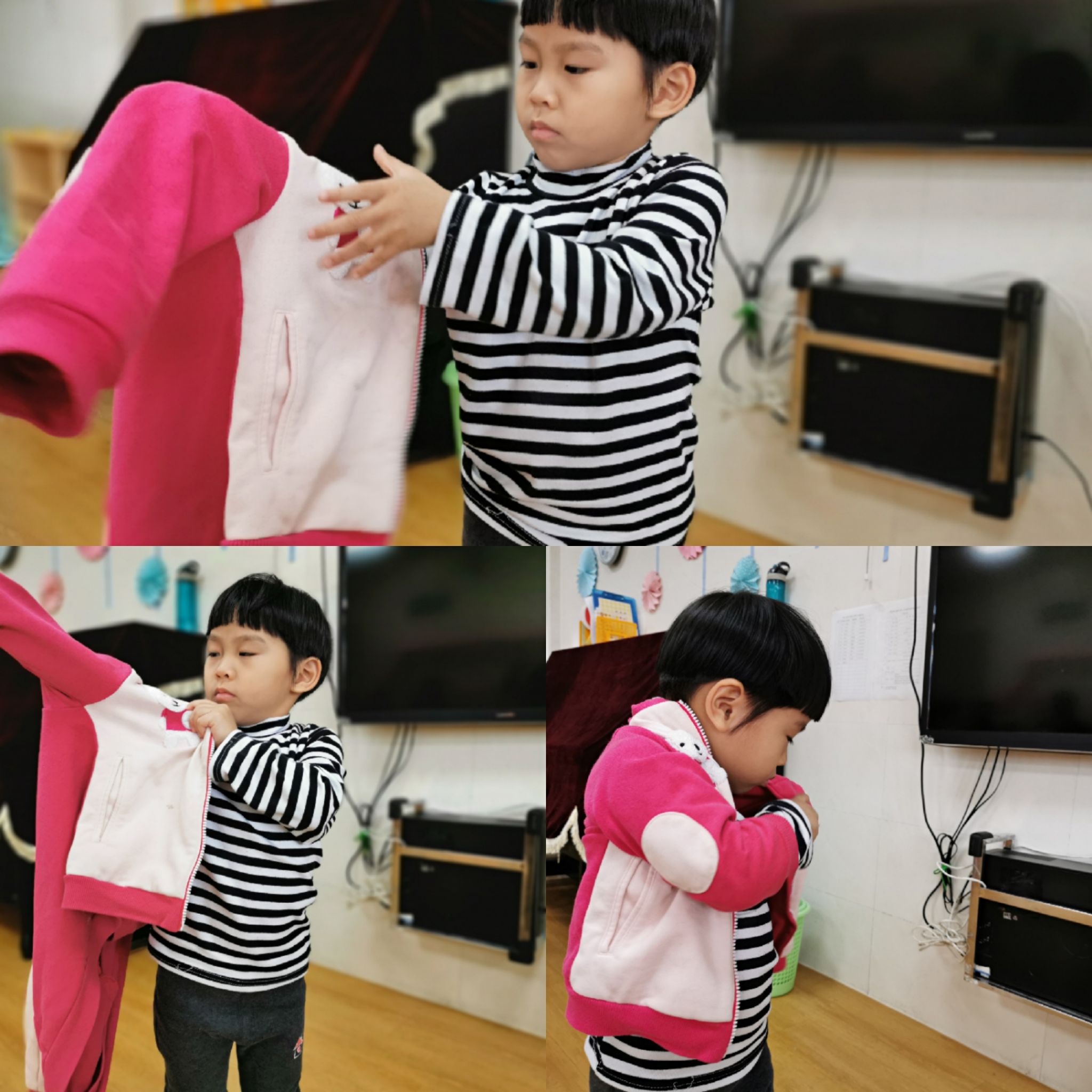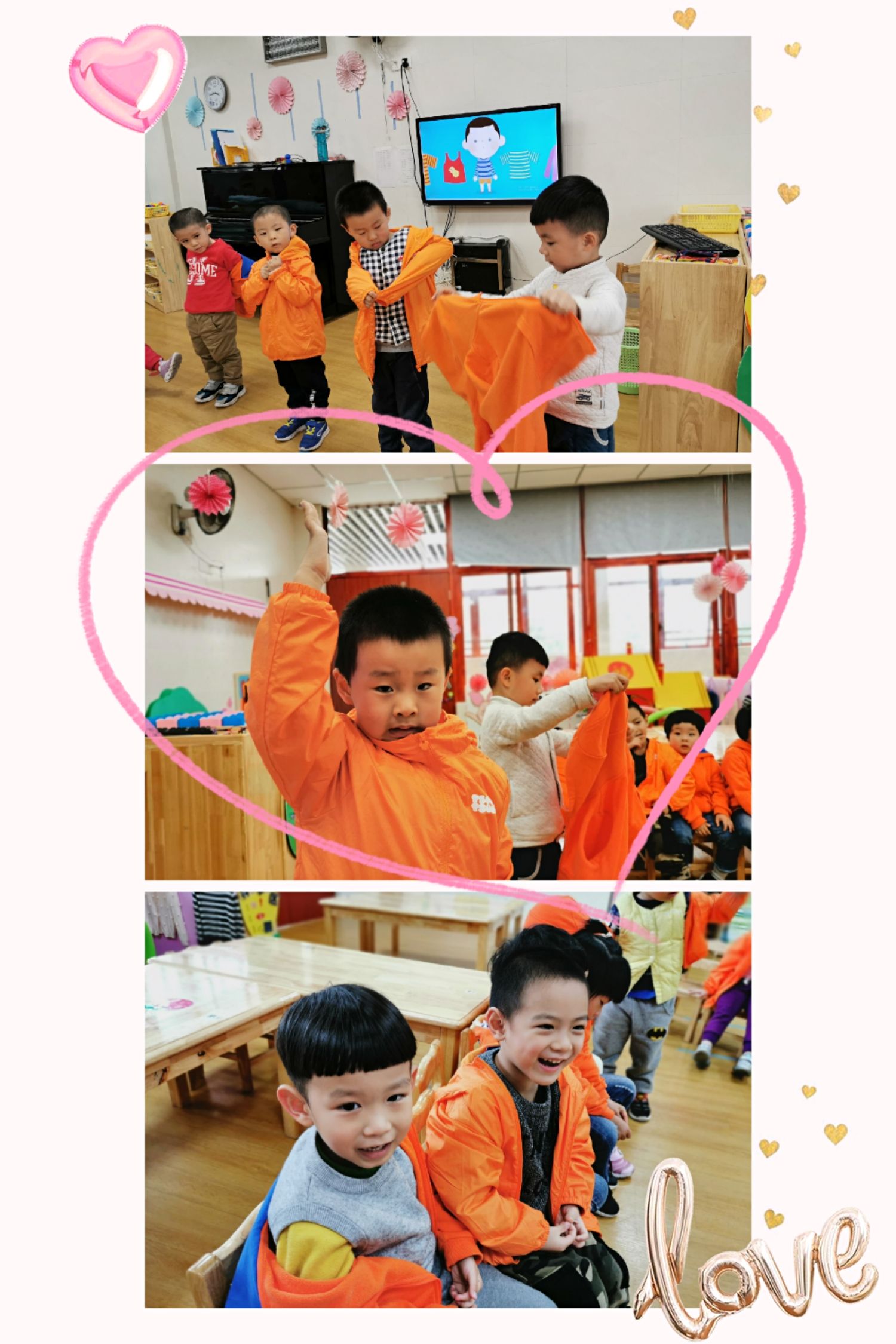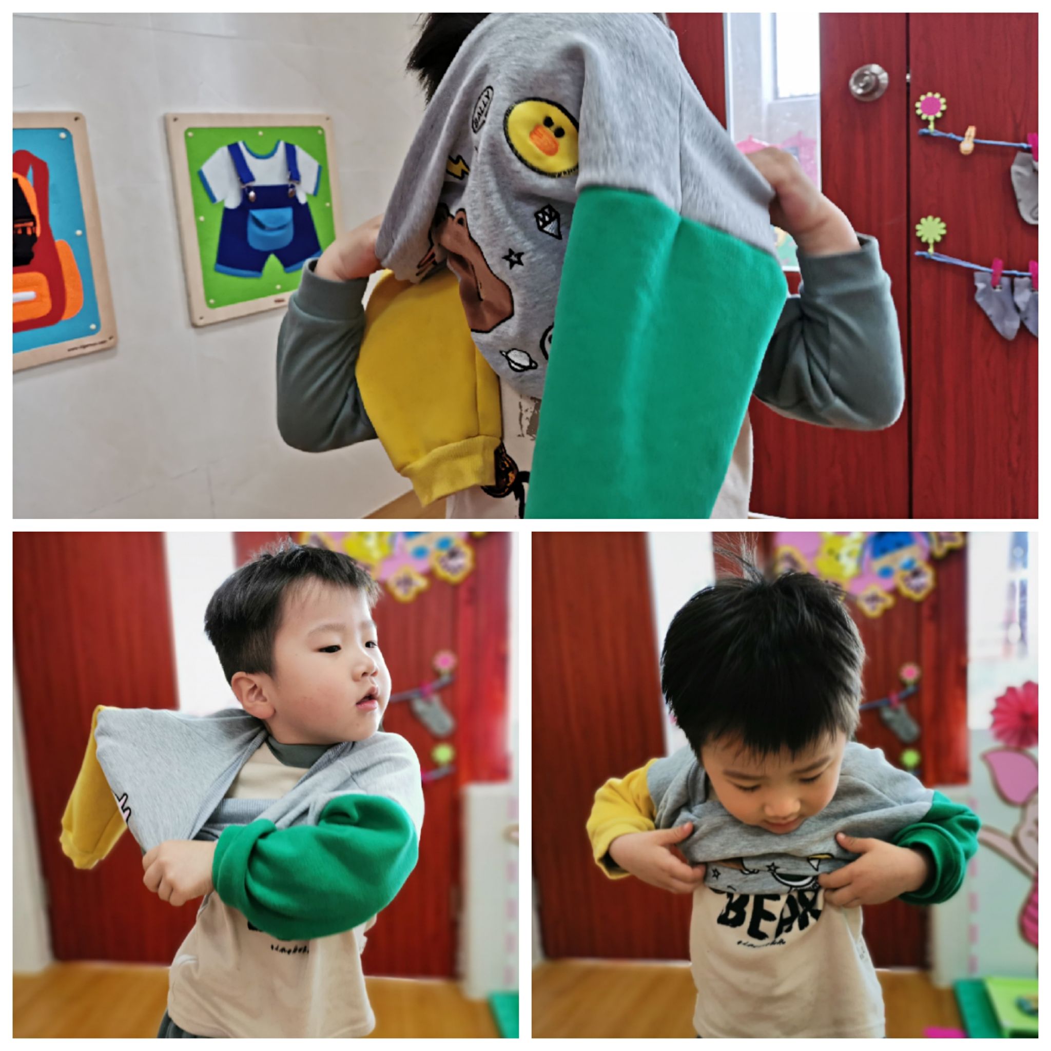 当然,在班级里也有很能干的宝贝哦,会自己尝试穿衣服,他们是谁呢?快看过来……