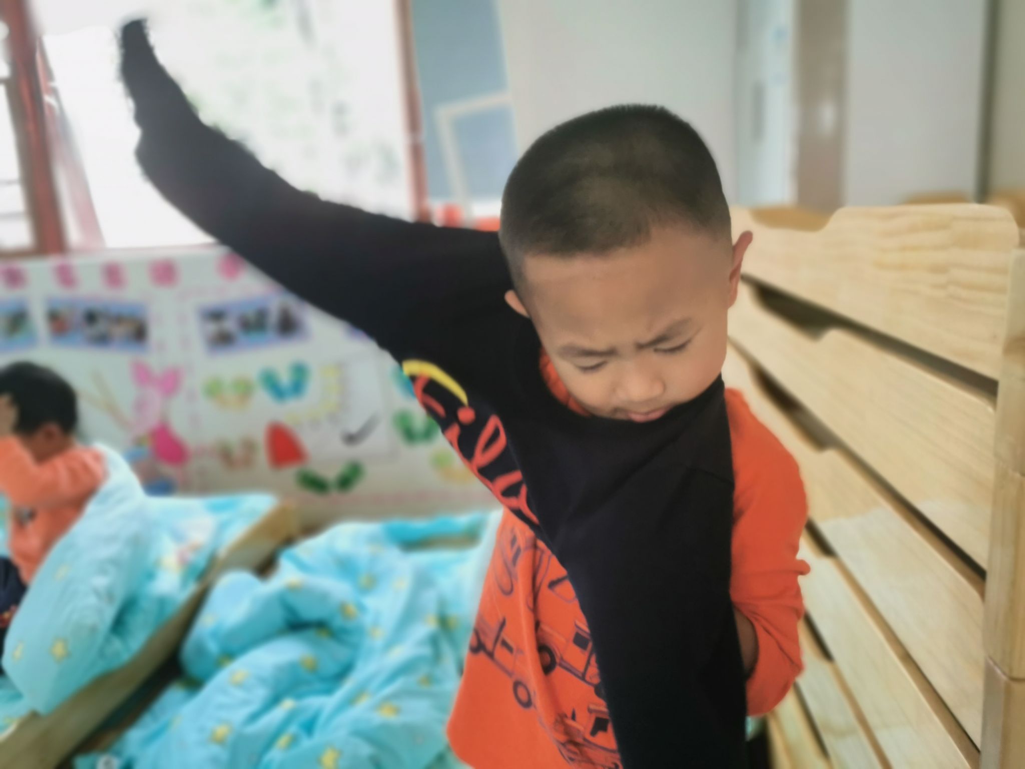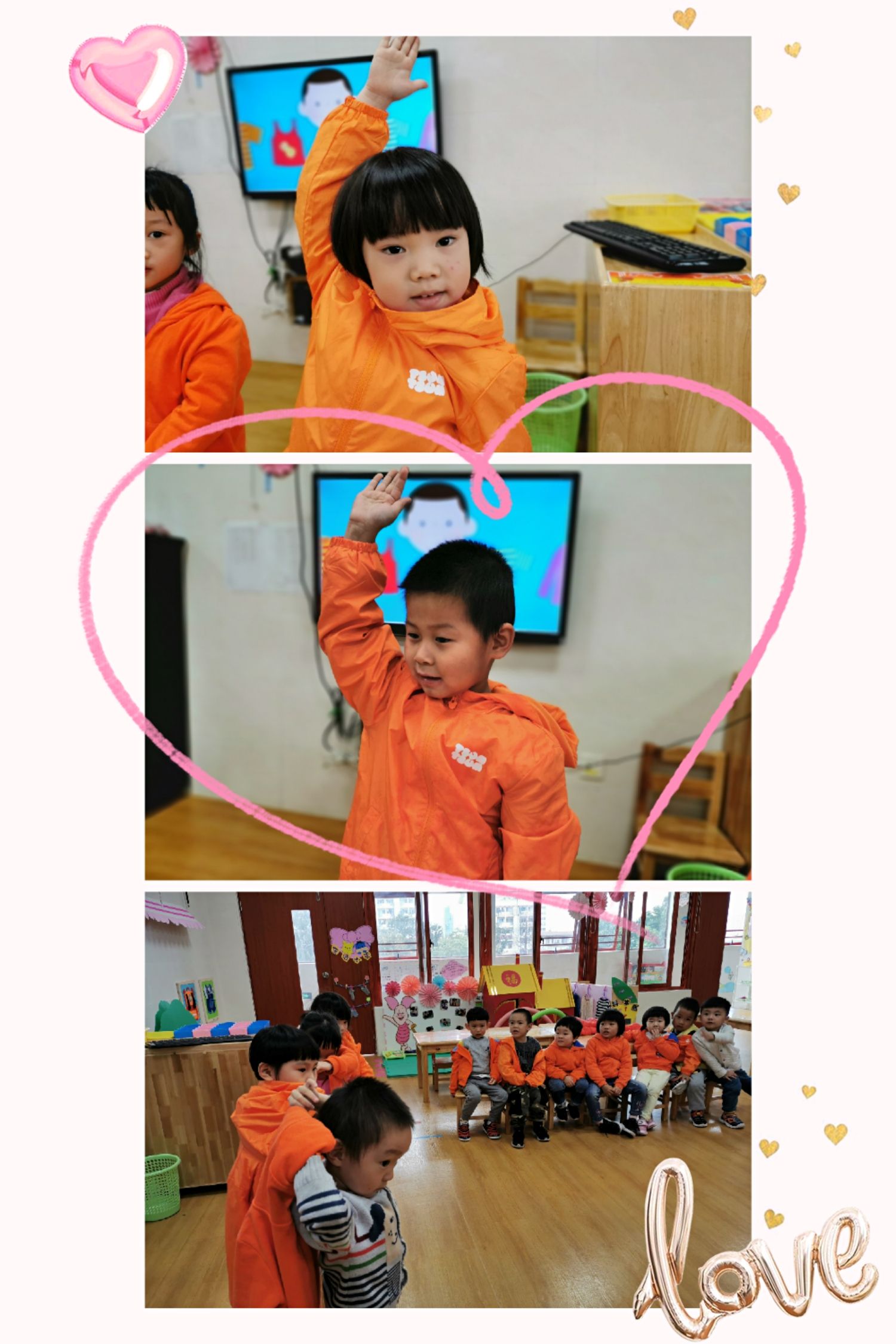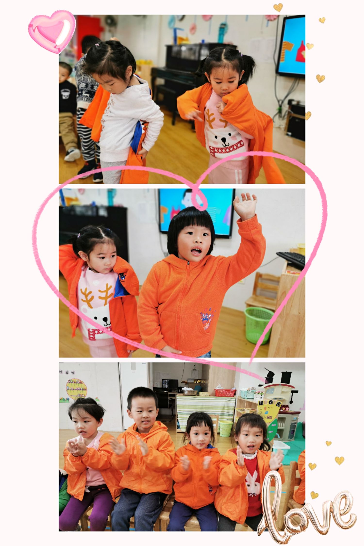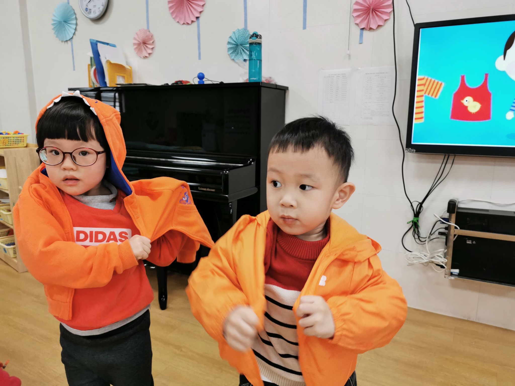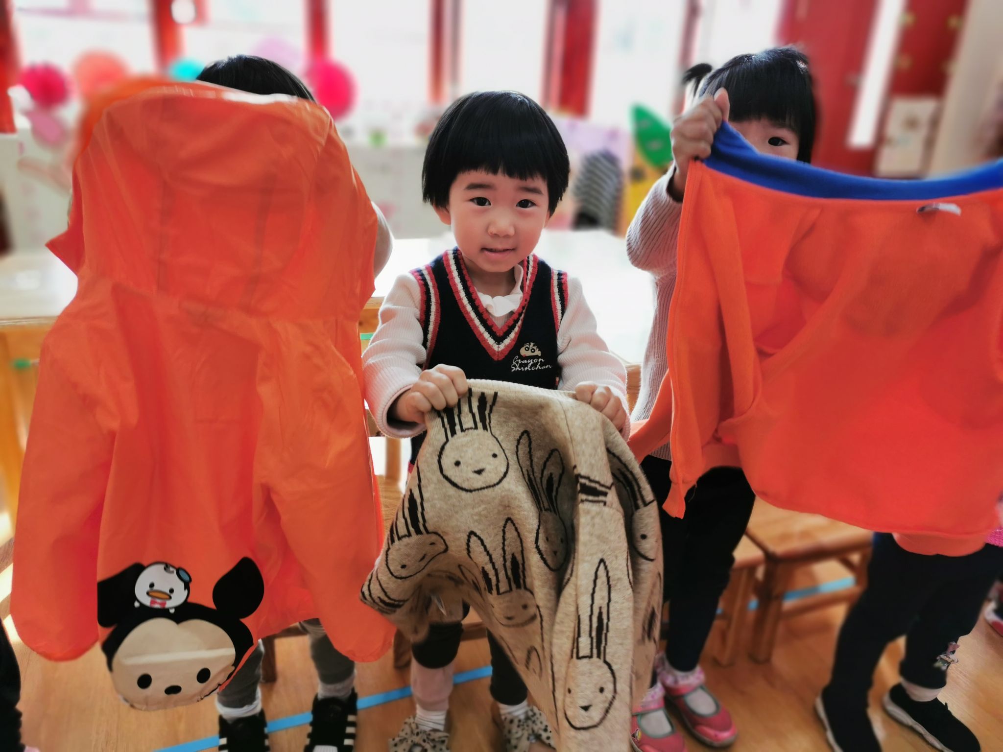 当然,在班级里也有很能干的宝贝哦,会自己尝试穿衣服,他们是谁呢?快看过来……