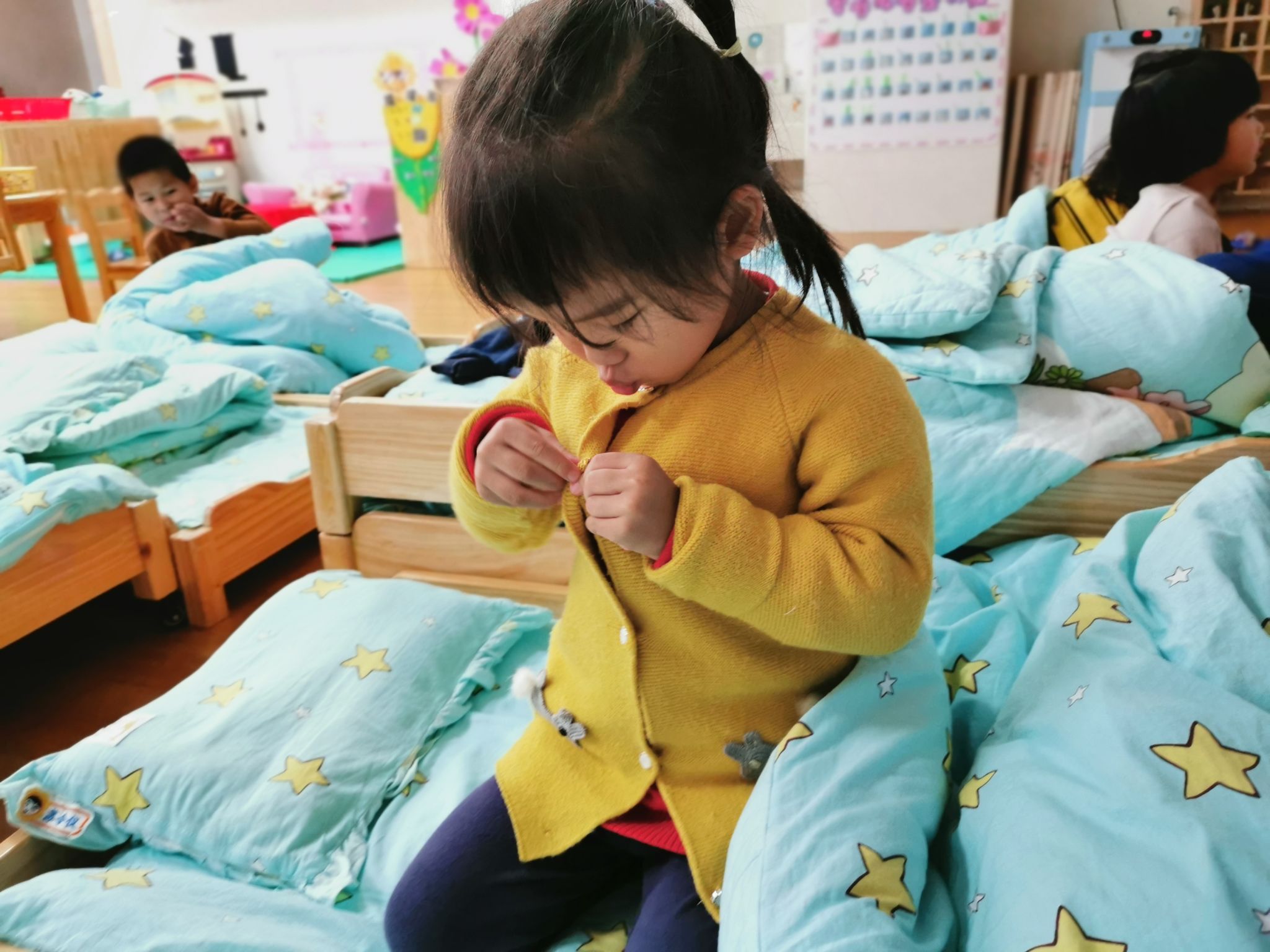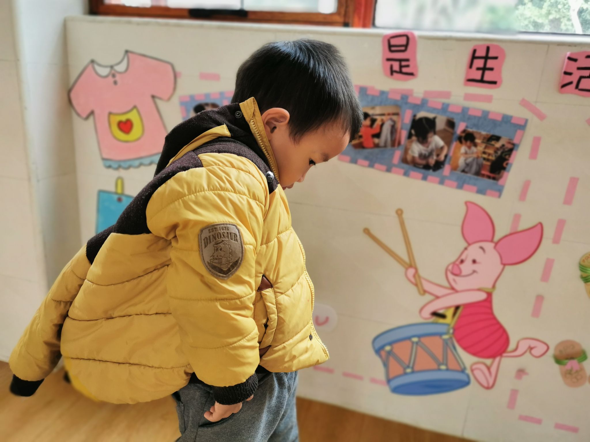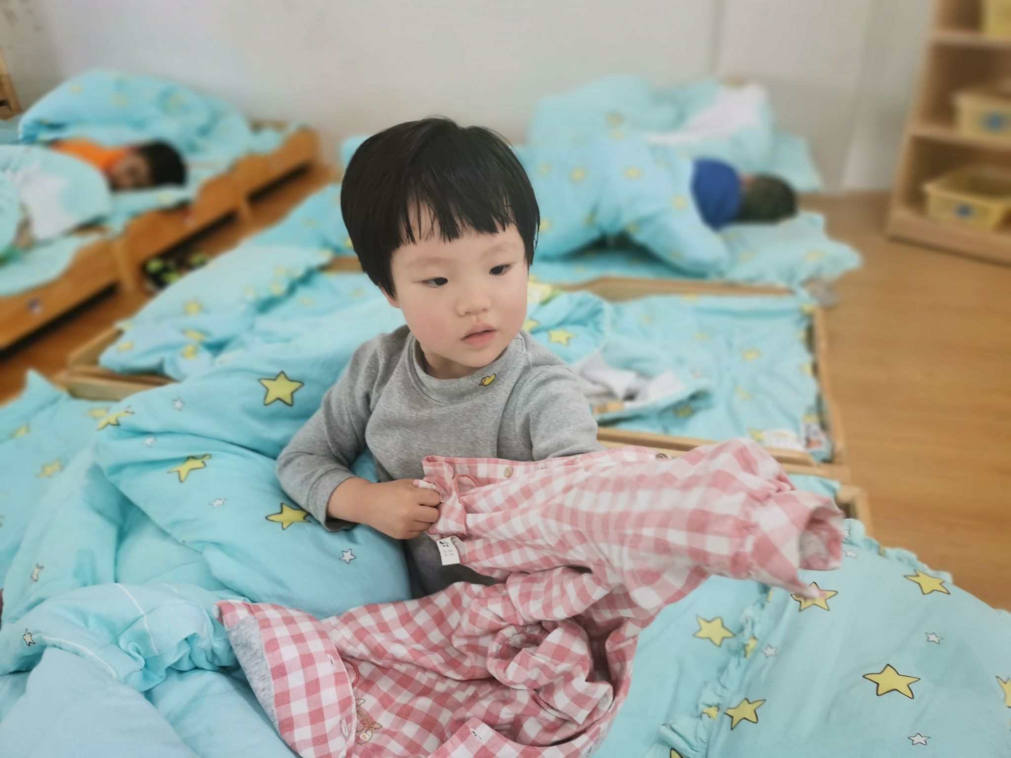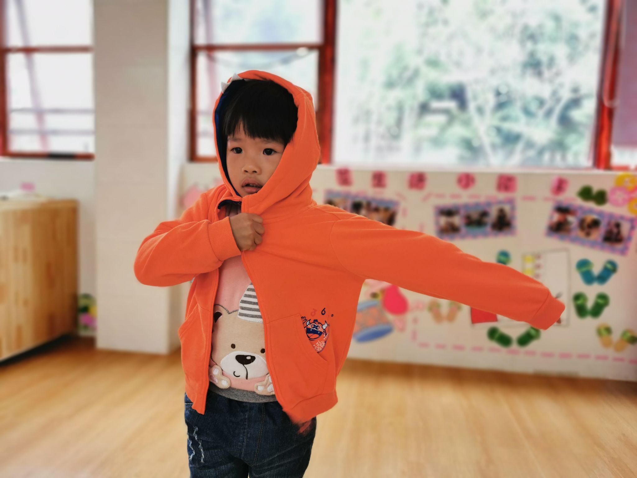 当然,在班级里也有很能干的宝贝哦,会自己尝试穿衣服,他们是谁呢?快看过来……