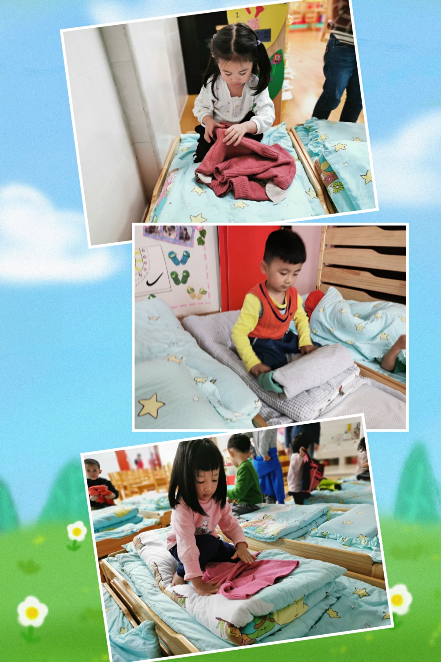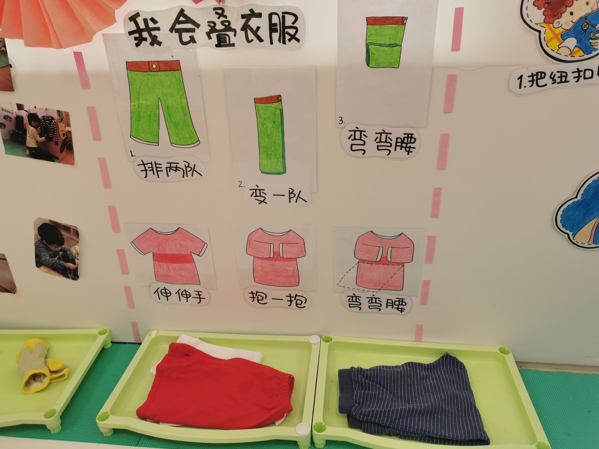 来,大家一起来“伸伸手,抱一抱,弯弯腰,我的衣服叠好啦!” 因为在区域里面投放了小朋友小时候穿过的小衣服来帮助他们练练手,所以现在宝贝们的这些本事都熟练多了。