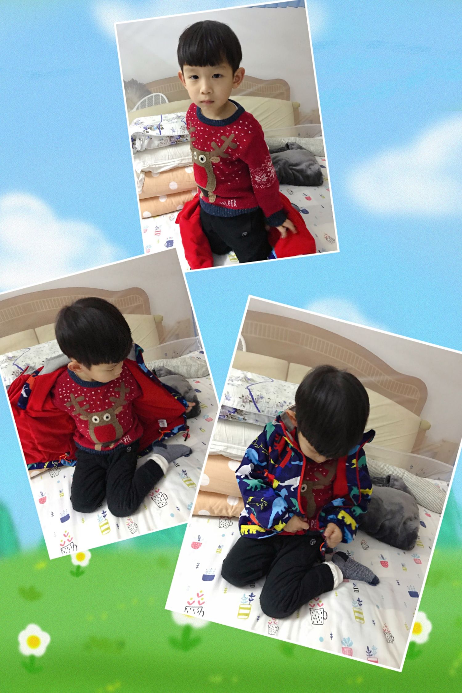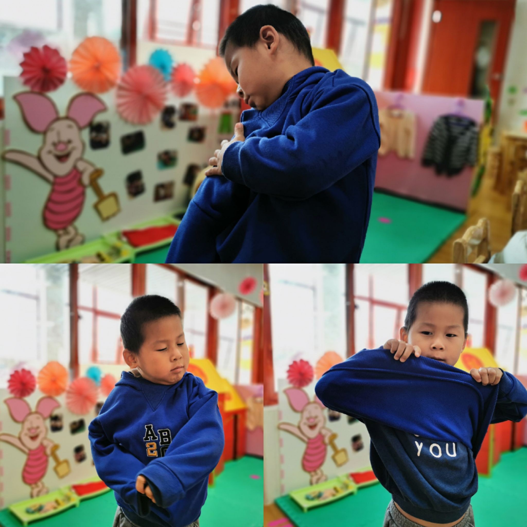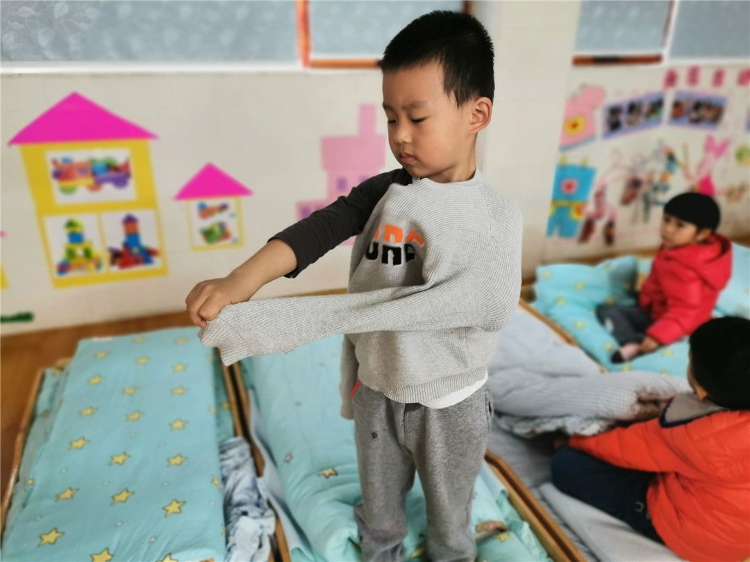 进入秋冬季节,天气转凉了,宝贝们一个个都穿成“小粽子”, 午睡前后大部分宝贝都带着同一表情:着急、委屈、纠结。有的找不到袖口、有的不会翻衣服前后导致穿反了等等,有的干脆抱着外套等待老师过来帮忙。来来来,我们一起来看看吧……