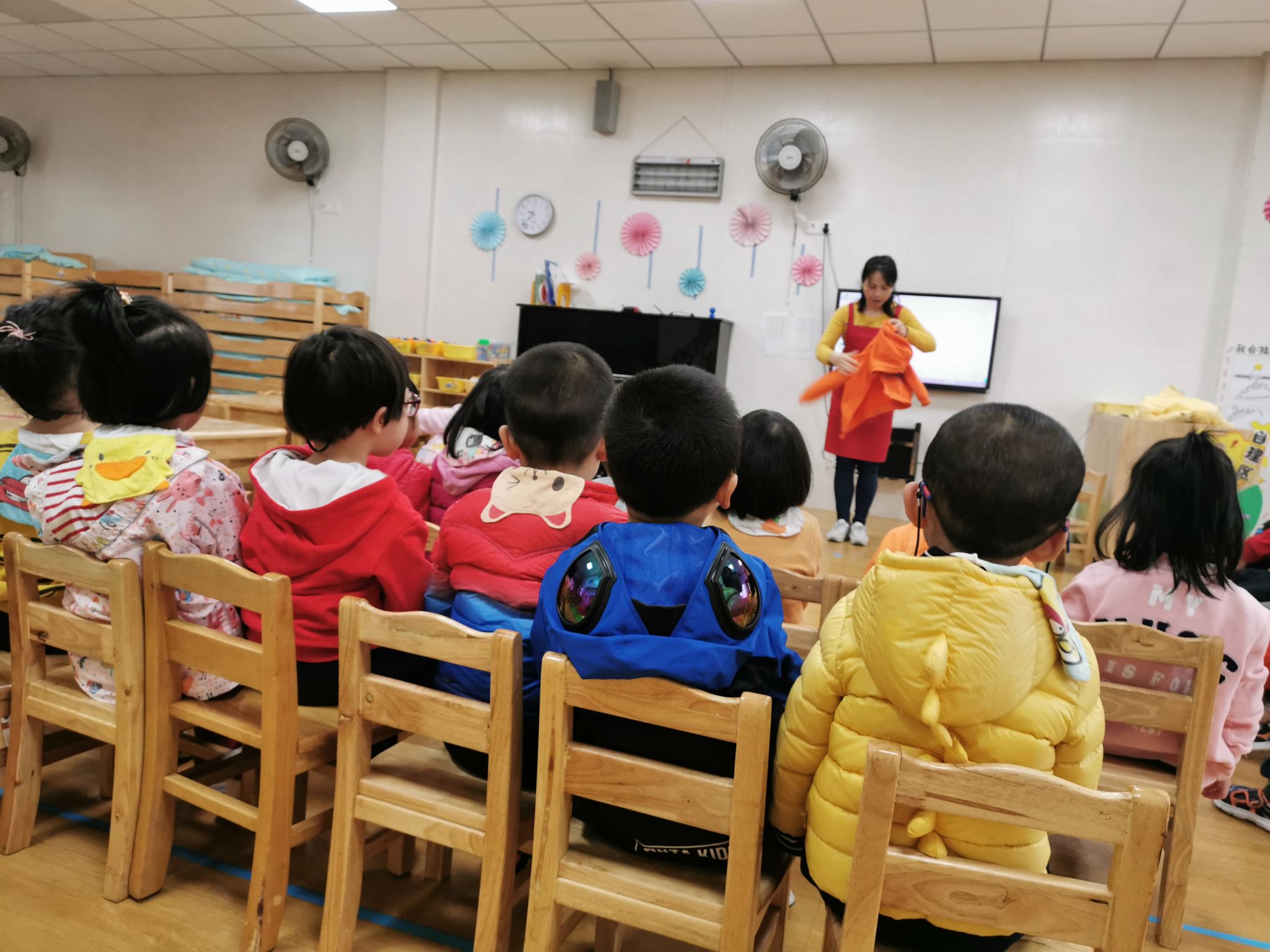 小朋友们拿着衣服一起跟着老师念穿衣歌:有图案,有拉链的是前面,有帽子的是后面……