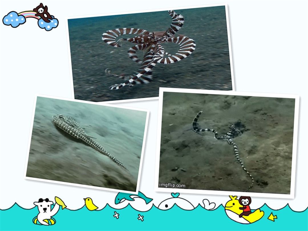 “快看,章鱼它又变成怪兽了。”“擅伪装、巧打扮可是章鱼的一大特长哦!章鱼的身体颜色和形状都可以变成模仿海藻、礁石、石块的样子,特别是拟态章鱼像孙悟空一样厉害,可以变成狮子鱼、魔鬼鱼、海蛇等等。
