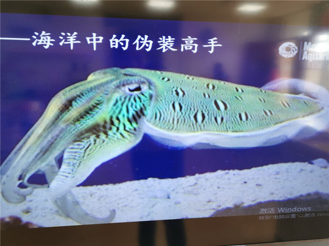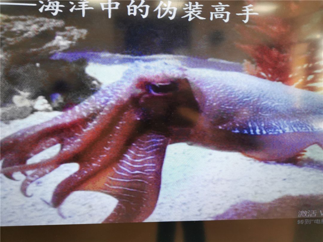 “这是墨鱼,它不仅能喷射毒汁、施放“烟幕弹”,还是一个变色大师哦,它的体内有黑、褐、橙、黄、红等色素细胞,在遇到敌人时,可以快速地把身体的颜色变成跟周围颜色相似的,把自己藏起来了。”