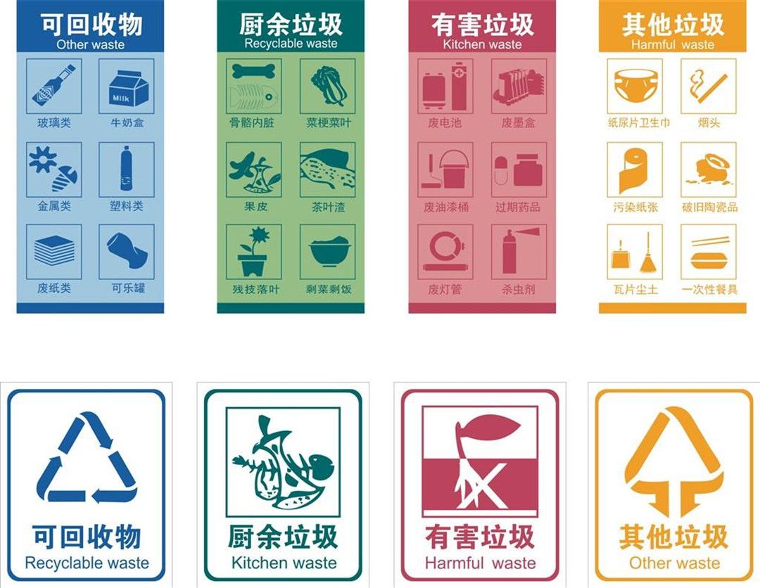 带着疑问,福娃们回家跟爸爸妈妈一起上网查找资料。噢!原来我们平常产生的垃圾,大致分为四种——可回收垃圾、厨余垃圾、其他垃圾和有害垃圾。可回收垃圾桶是蓝色的,厨余垃圾桶是绿色的,其他垃圾桶是黄色的,有害垃圾是红色的。