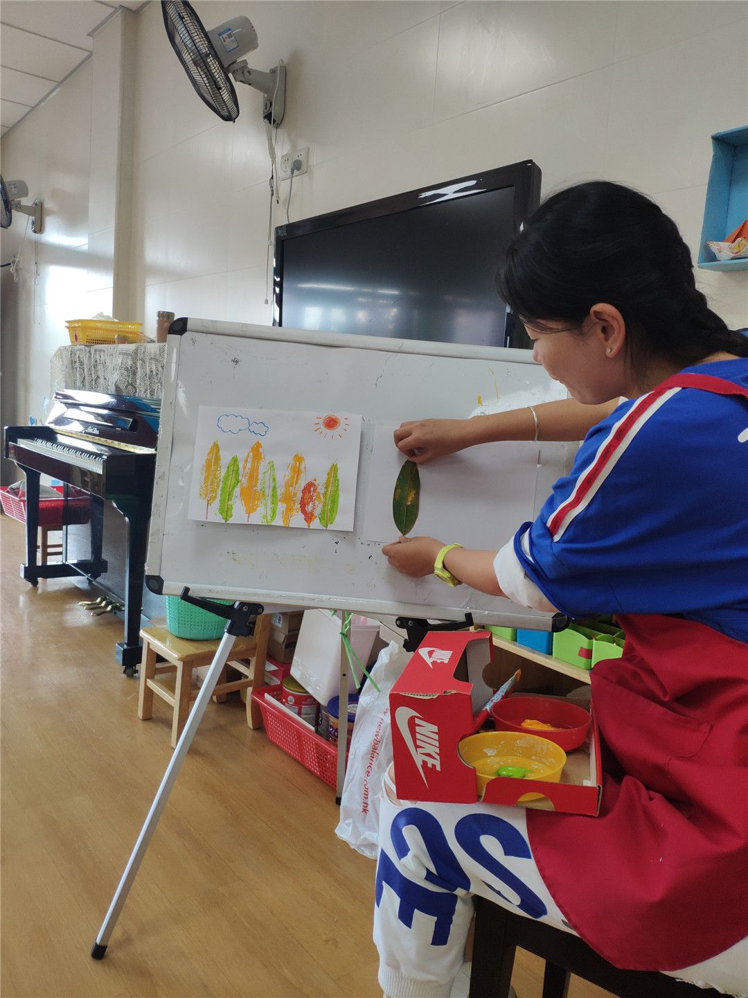 “秋叶的衣服过几天就坏掉了,怎么办呢?”“我们可以给秋叶穿上新衣服呀!”梅子老师教我们:先拿起秋叶,用笔蘸颜料,帮秋叶穿上了红色、黄色、绿色的新衣服,再拿起树叶,将秋叶的新衣服印在纸上。