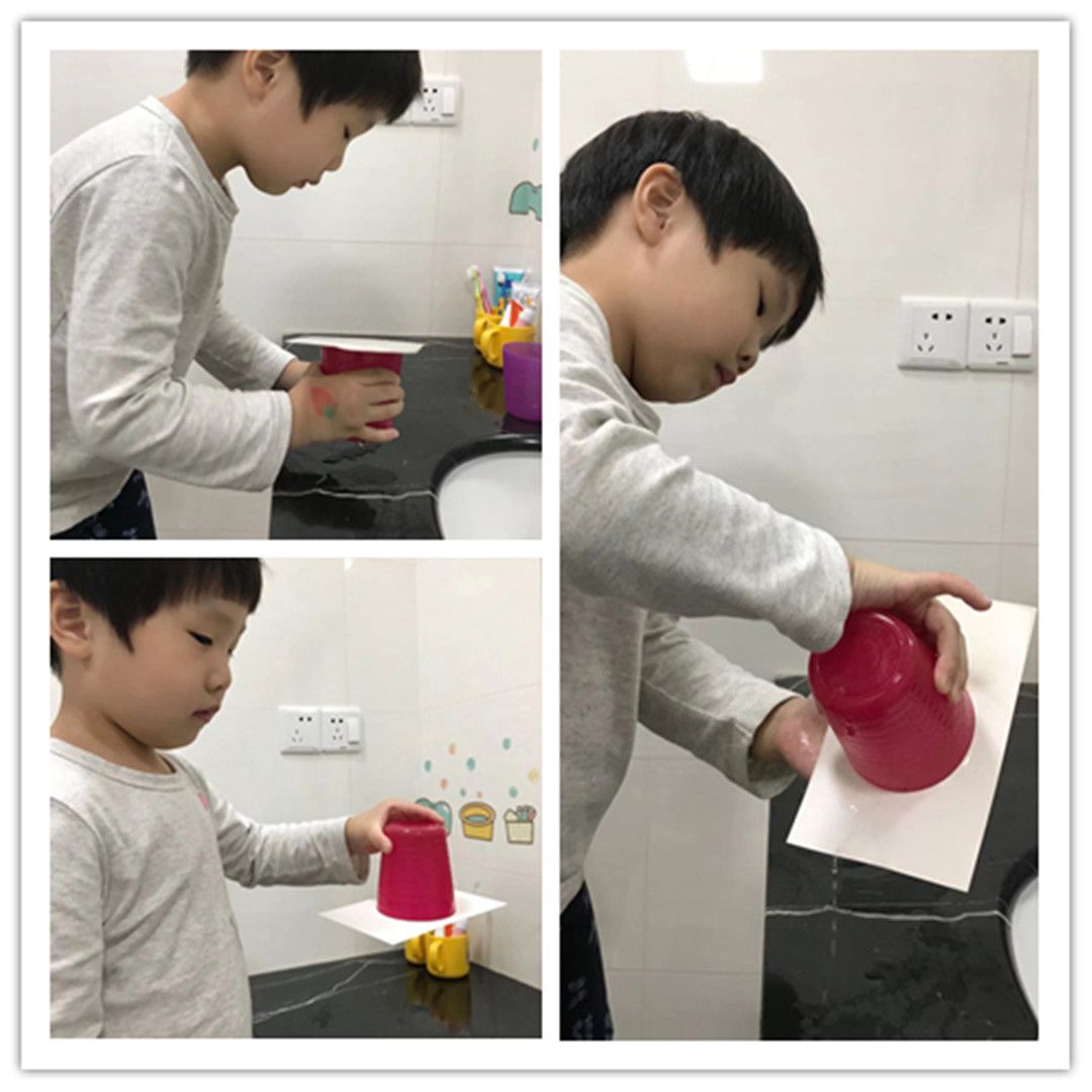 萌娃们不光对风的现象感到好奇,对大千世界的各种各样的物体充满着好奇,回到家里跟着爸爸妈妈一起看书、上网学习,自己还动手做实验。在实验探索中不但发现球在水中浮的现象,还发现了原来纸会吸附在杯子上不会掉下来呢。