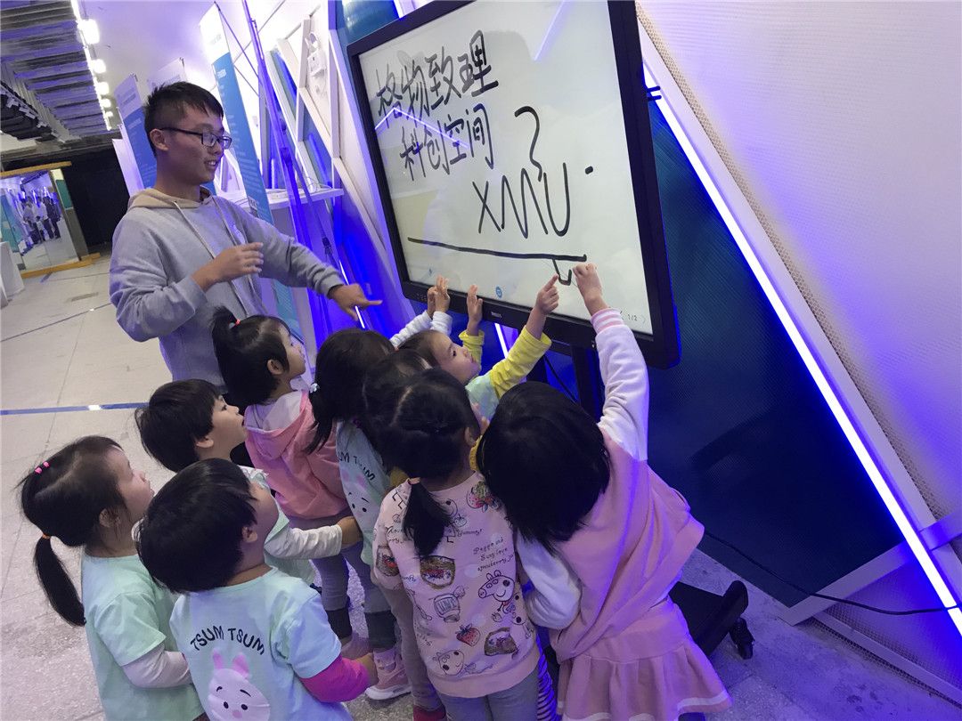 “辉光球”“万丈深渊”、“太阳系演示模型”……每一个实验都吸引着萌娃主动参与,特别是志愿者哥哥结合椎体上滚、声悬浮等实验告诉萌娃们发现重力和声音带来的的神奇体验,给萌娃们上了一节生动的科学活动。