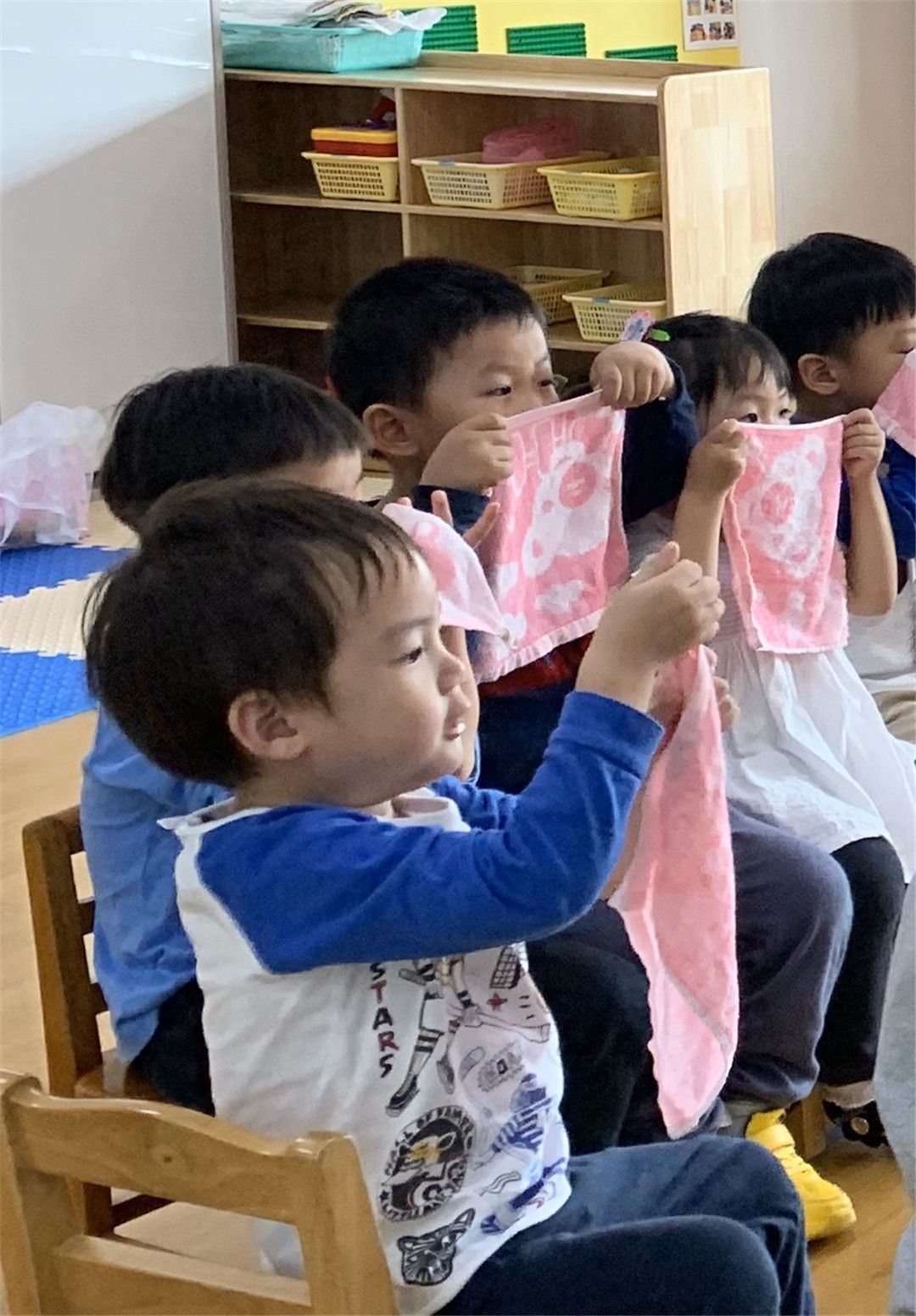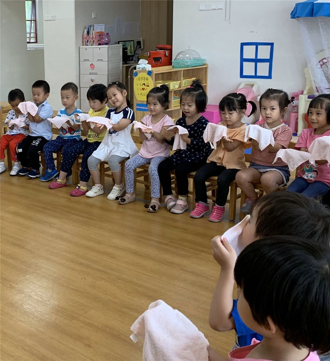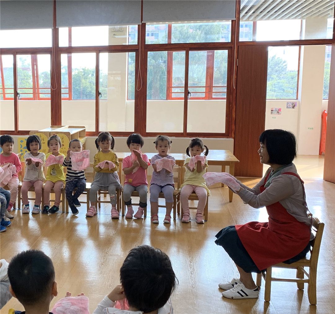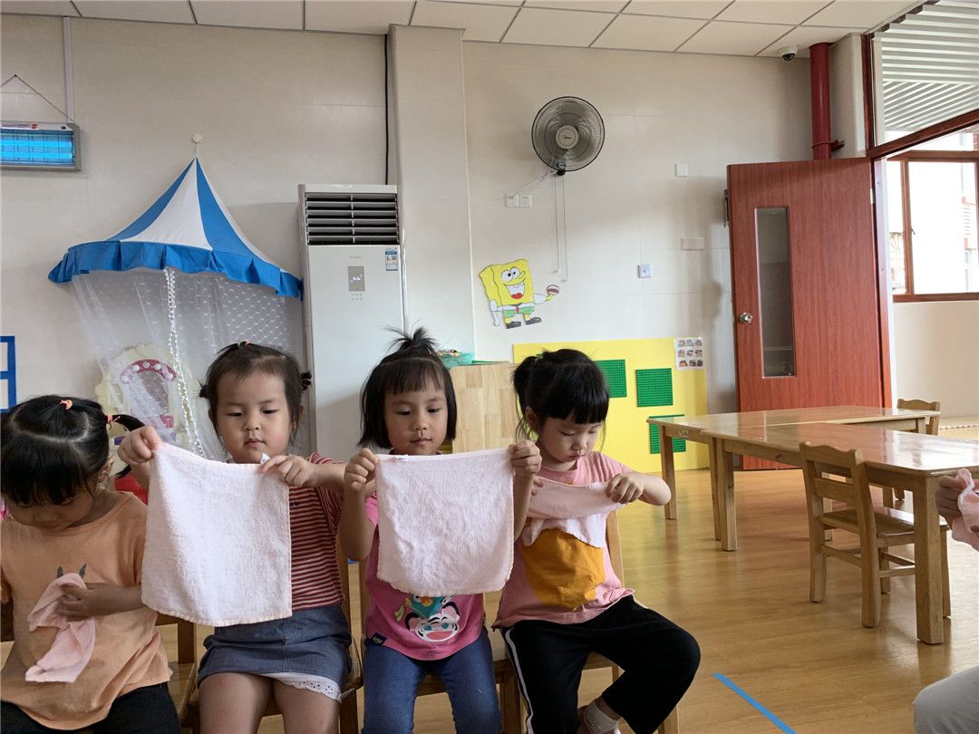 这不,老师看着我们手上的毛巾,向我们提出了问题:你们的小手能用小毛巾把小脸擦干净吗?怎么擦呢?我们纷纷举起手来……