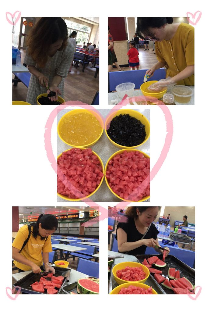 紧接着,妈妈们帮忙把水果、仙草、石花切成一小块一小块。
