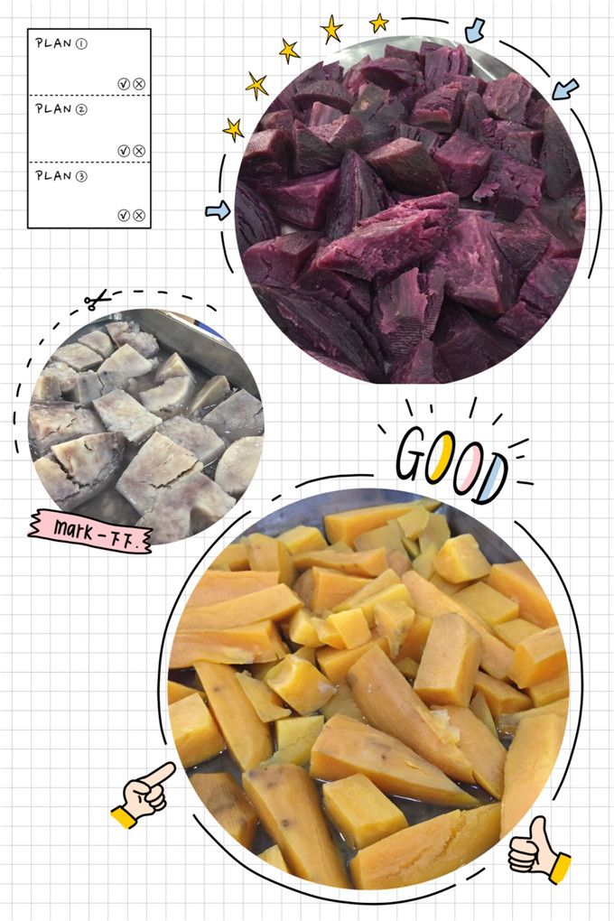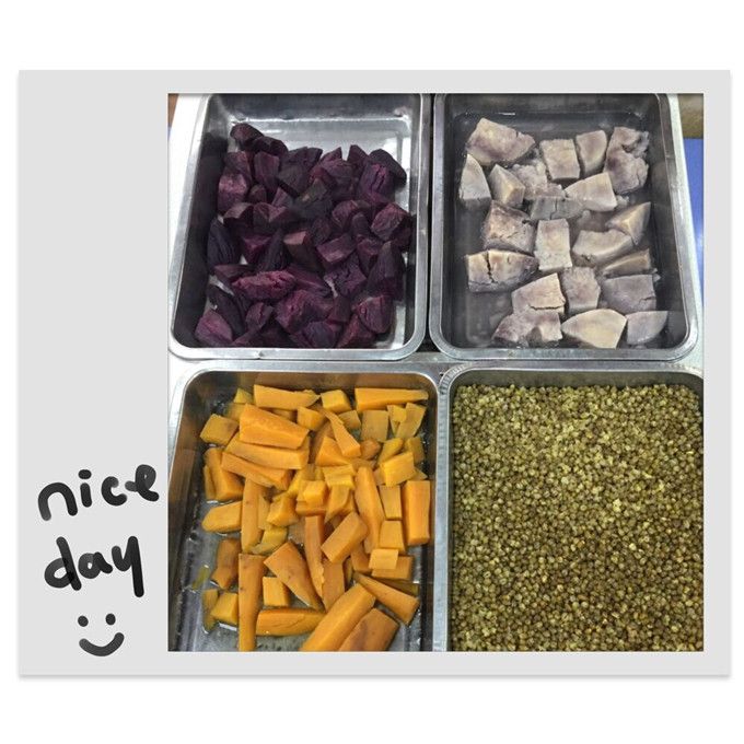 先把地瓜、紫薯、芋头、绿豆煮熟,烫呼呼的食物全靠芙蓉餐厅的大厨师们帮忙处理了。