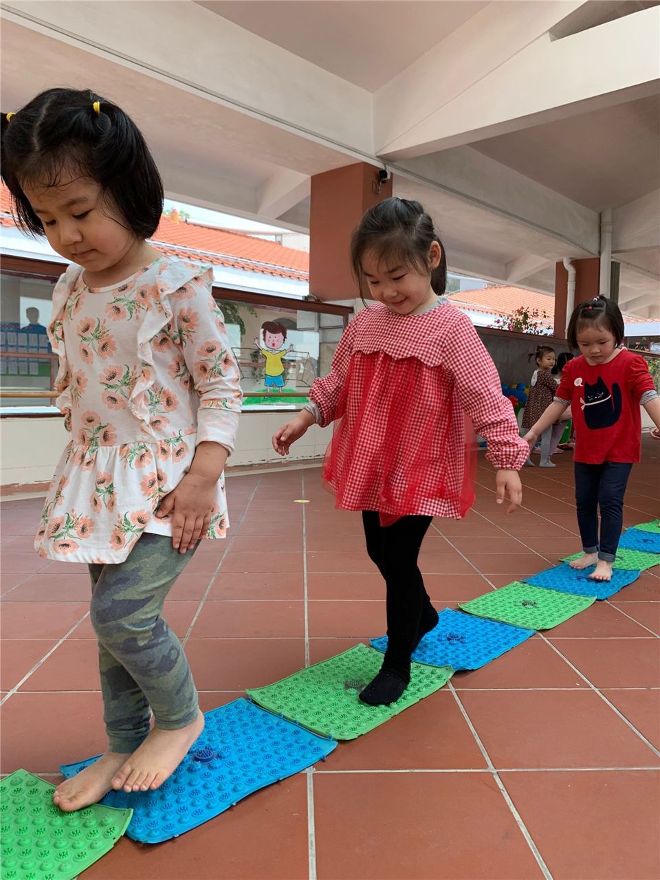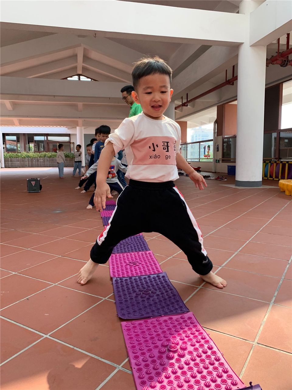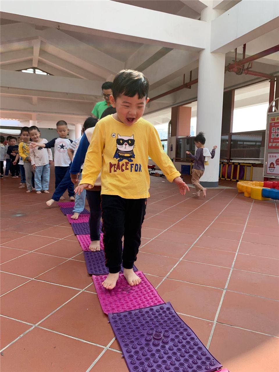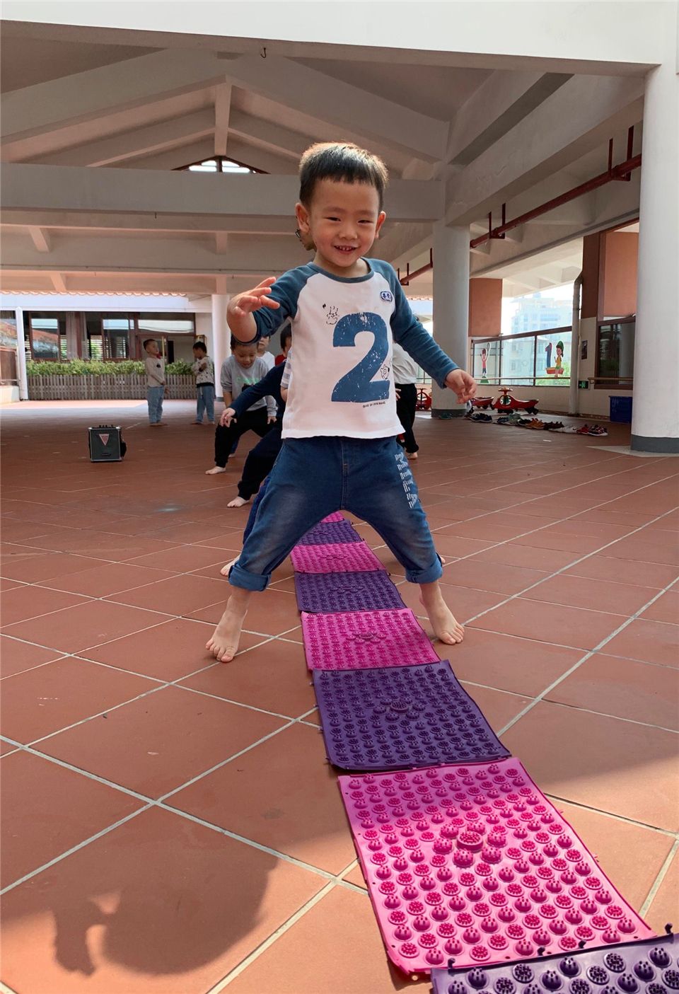 小小指压板,体验乐趣多。今天小六班宝贝们和指压板做了一次好玩的游戏,各个乐开了怀。快快把鞋子穿好吧!