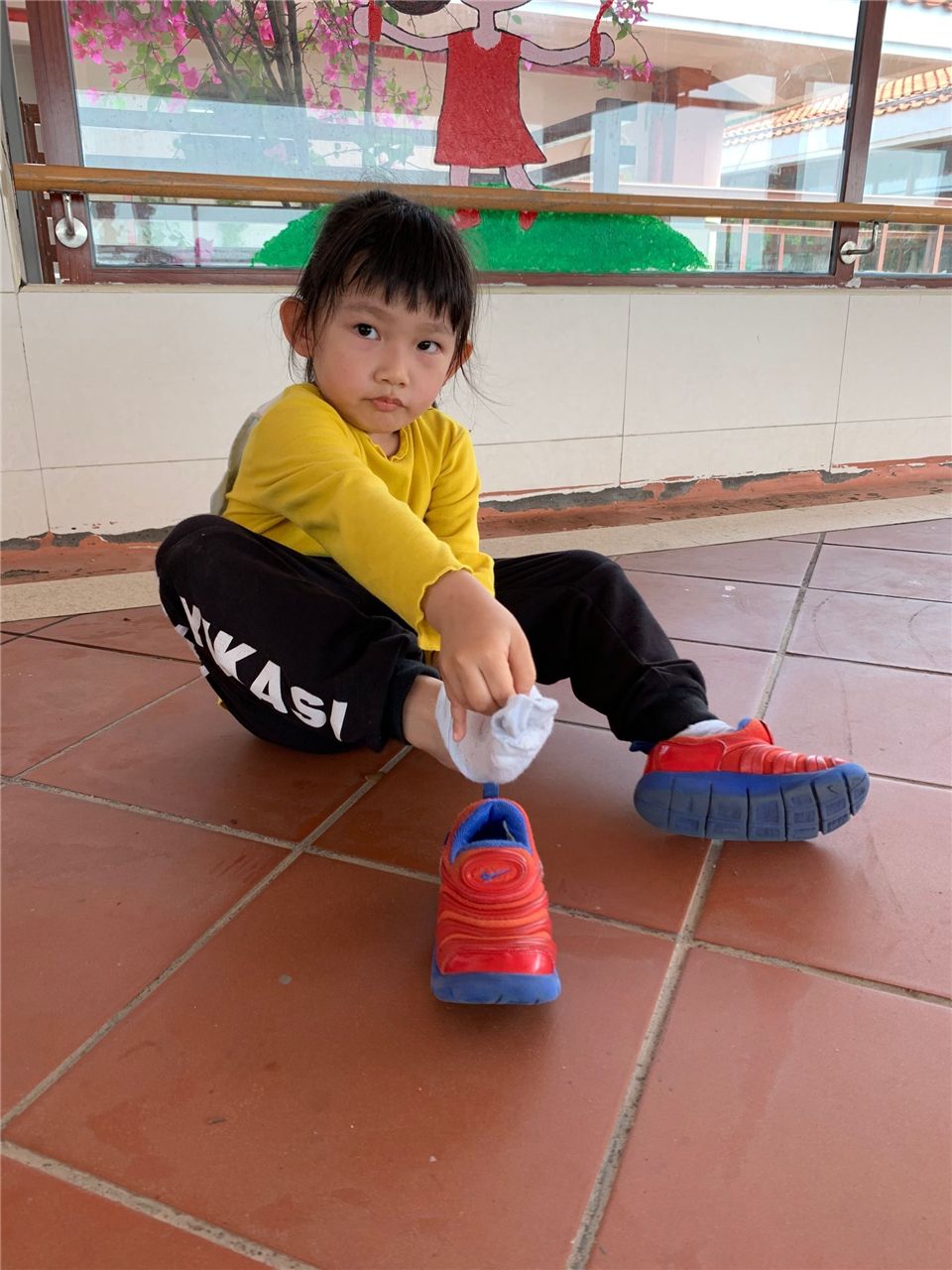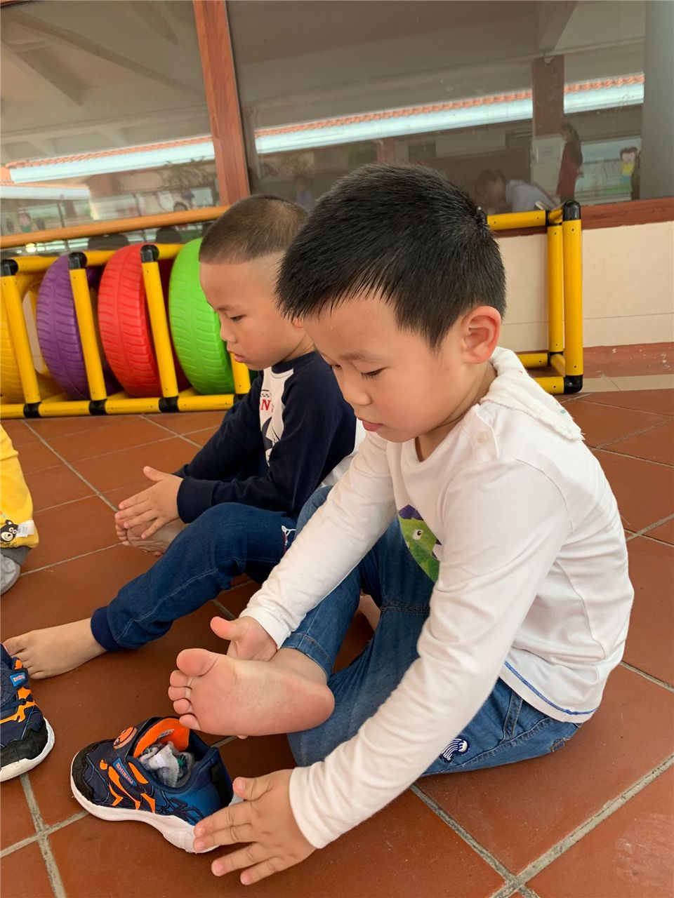 穿鞋前,要记得先把脚上的灰尘先拍掉噢!做个爱干净的好宝宝