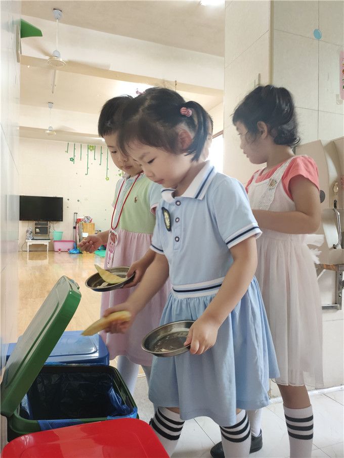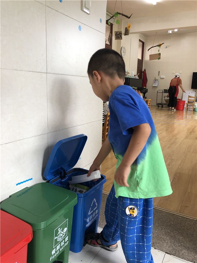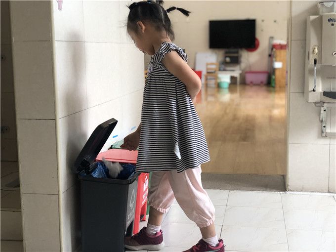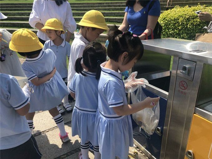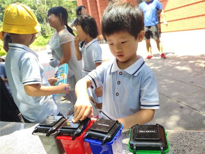 手里满满的垃圾不一会儿就被孩子们又“快”、又“准”的一一分类,并放进了不同的垃圾桶里了。