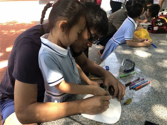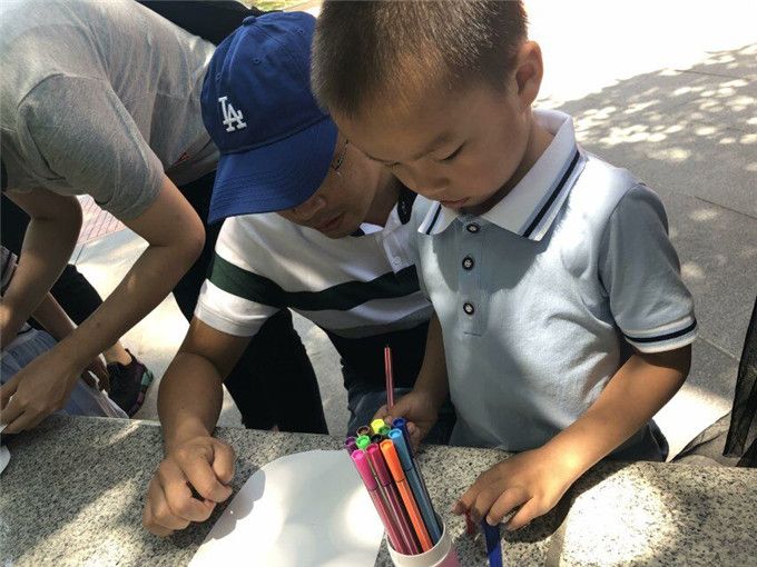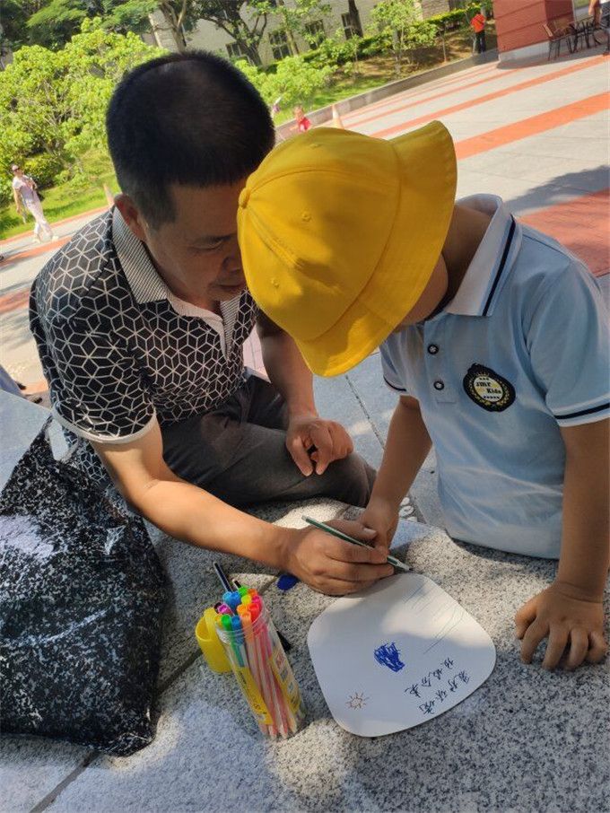 开始行动咯!爸爸妈妈和孩子们一起在扇面上画起了垃圾分类的标语。
