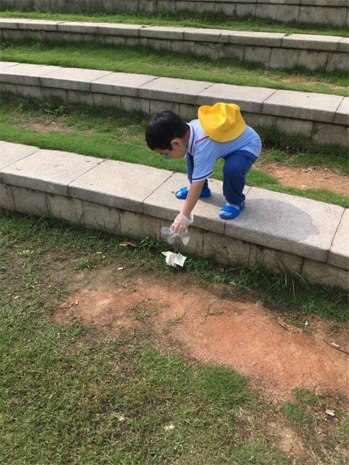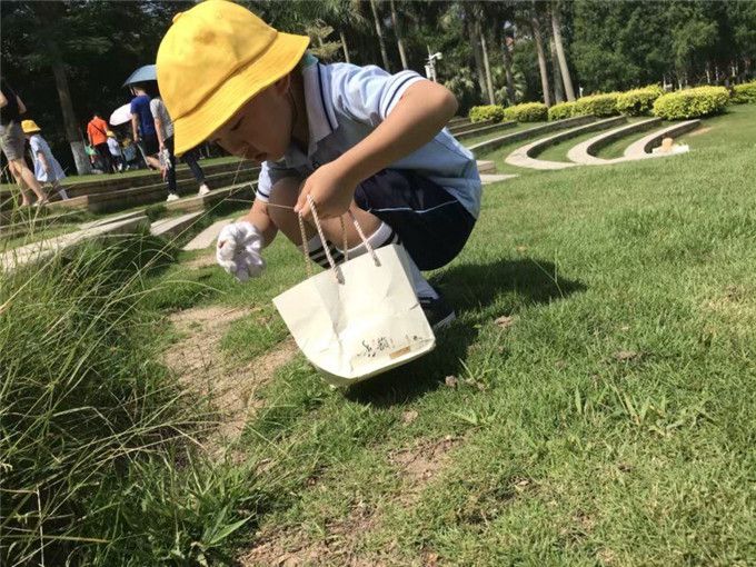 瞧!美丽的校园里,一群小黄帽出动啦!他们手上拿着垃圾袋,带着愉快的心情,开启了今天的环保小达人亲子活动。