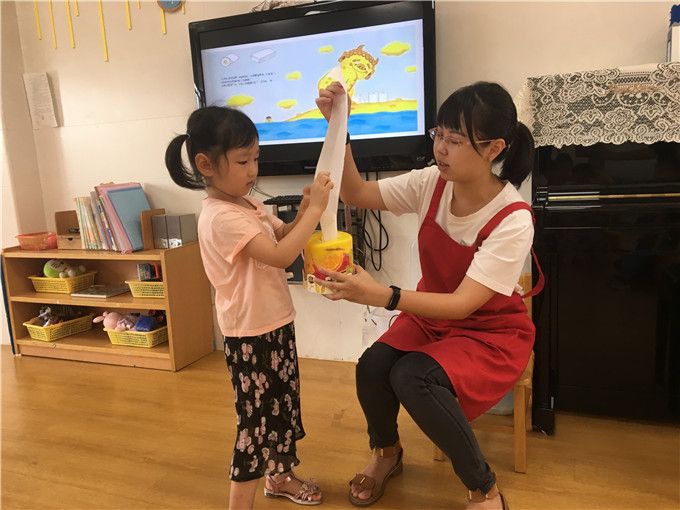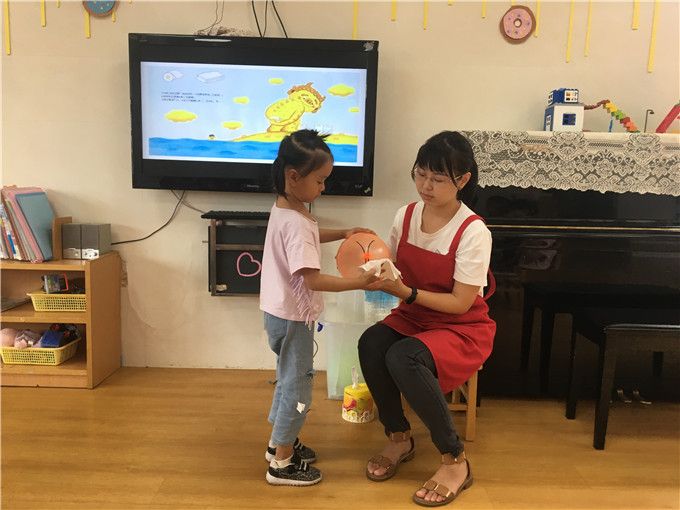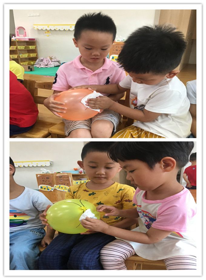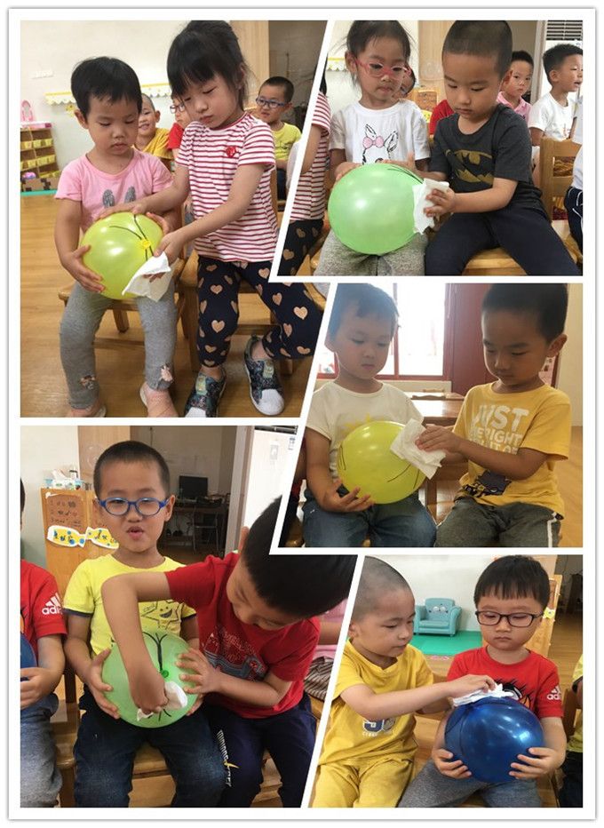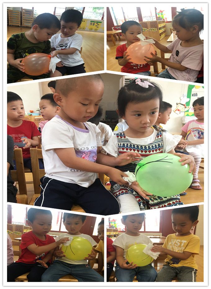 一起行动吧!萌宝们一手抱着气球宝宝,一手拿着纸巾。有的两两合作,一人抱气球,一人擦屁屁。润哥一边擦一边说道:“要由下往上擦!”边上的小羿附和道:“ 擦完一次要折一折,才能再擦。”