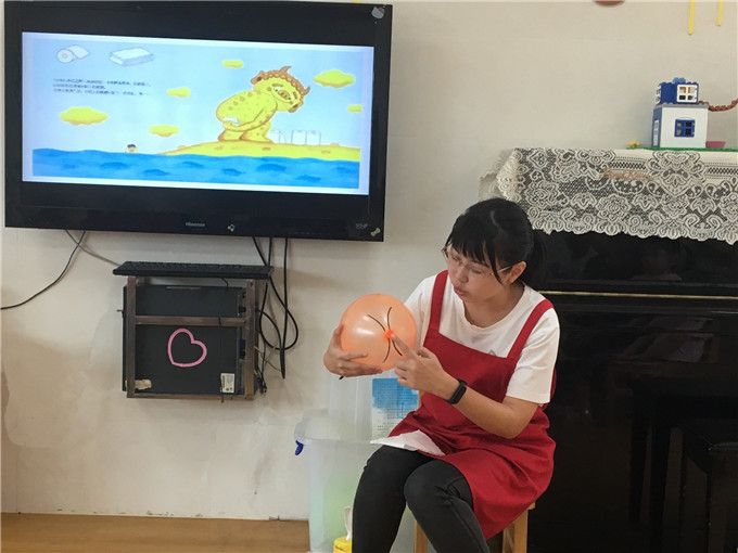 老师拿出早已准备好的气球。笑眯眯的气球宝宝真可爱,将气球翻转过来,咦?原来气球宝宝也有屁屁。只听老师说道“小气球看到书里的擦屁屁方法,它也想学,谁来教教它?”