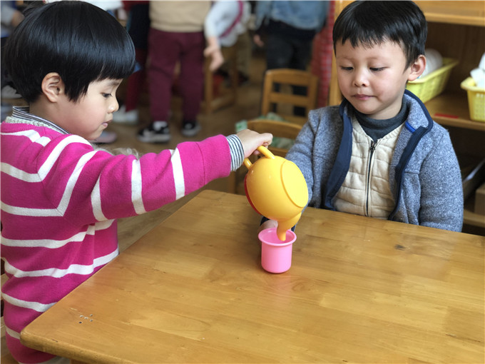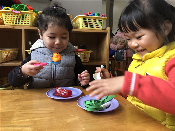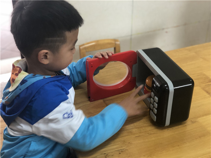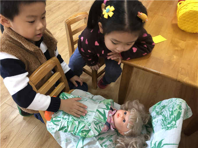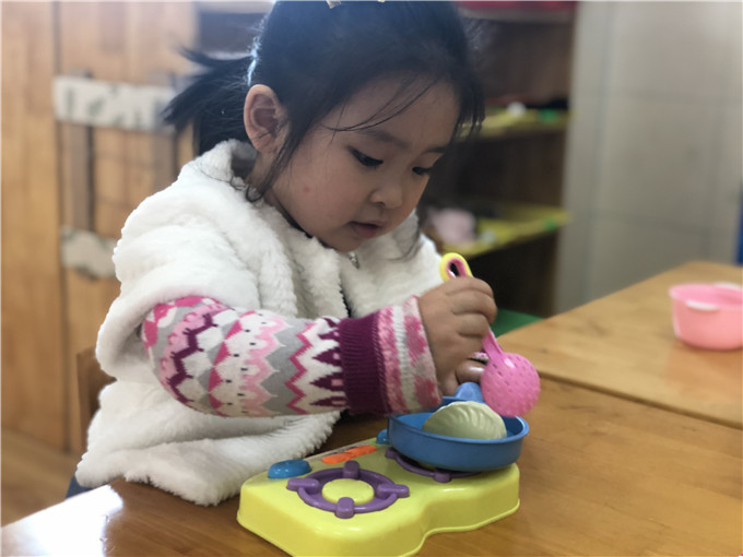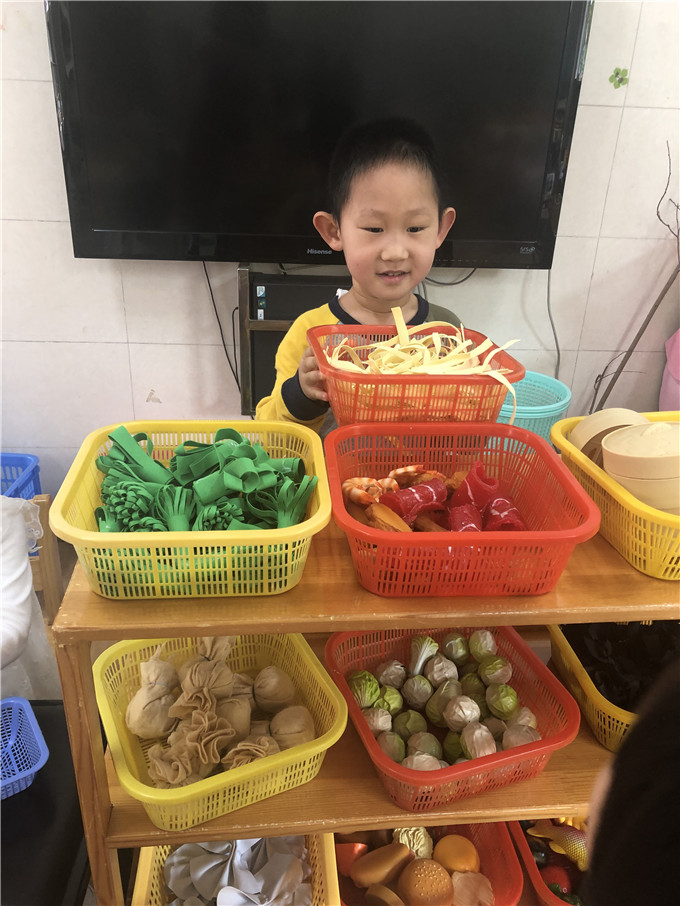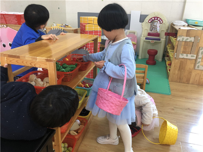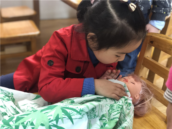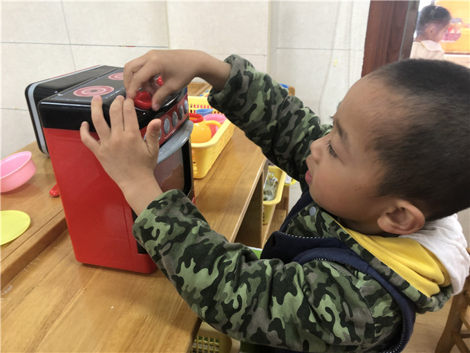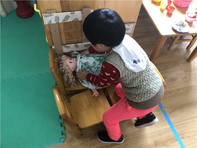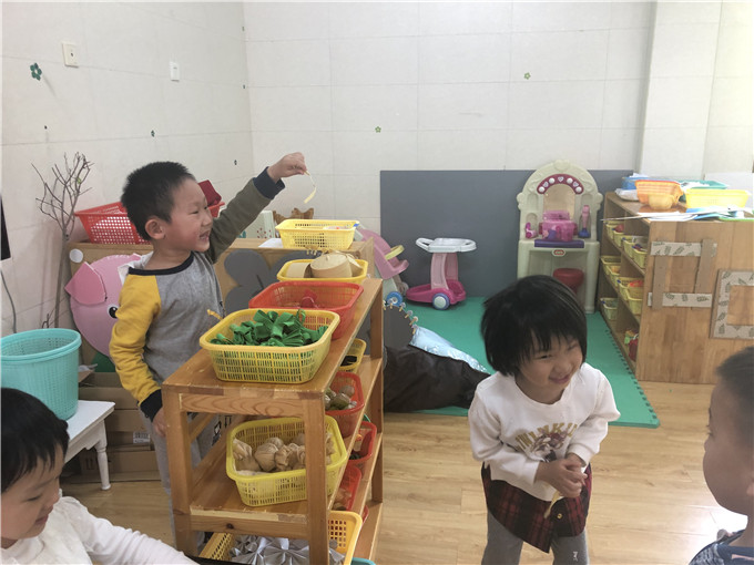 娃娃家里的“小大人们”也是有模有样,“妈妈们在家做饭”,“爸爸们出门买菜”。