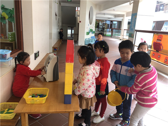 两个“爸爸妈妈”排着队,聊开了:“我要取钱给我宝宝买馒头。”