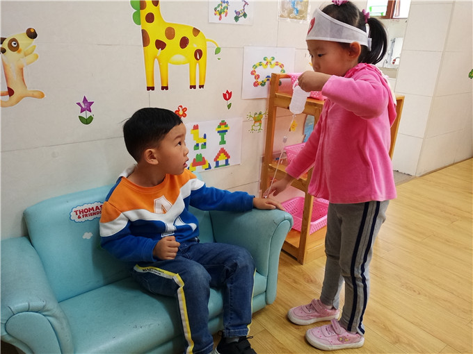 “小小医生”有模有样的为“病人”看病。