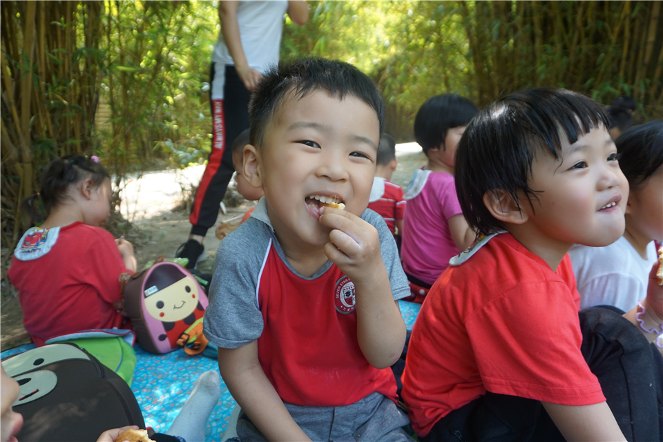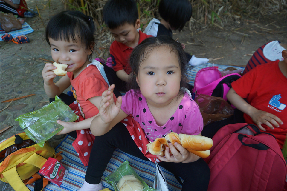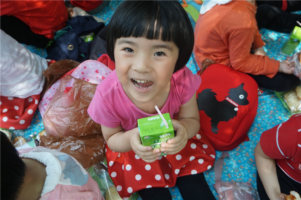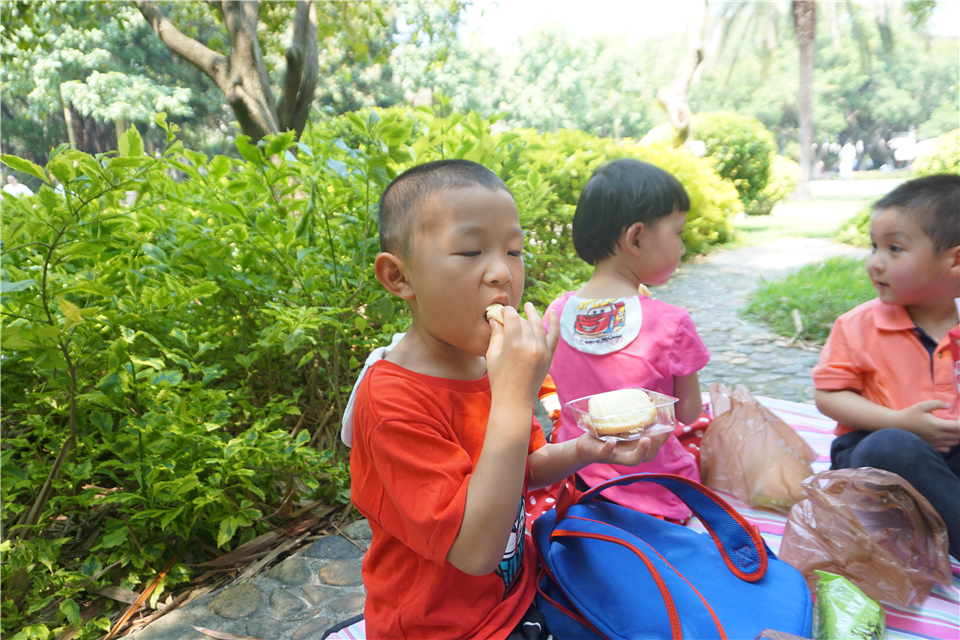 有趣的游戏过后也该补充能量啦!“老师,我肚子饿了。”野餐垫一铺,宝贝们放下小书包,拿出好吃的点心,坐下来津津有味地吃了起来。