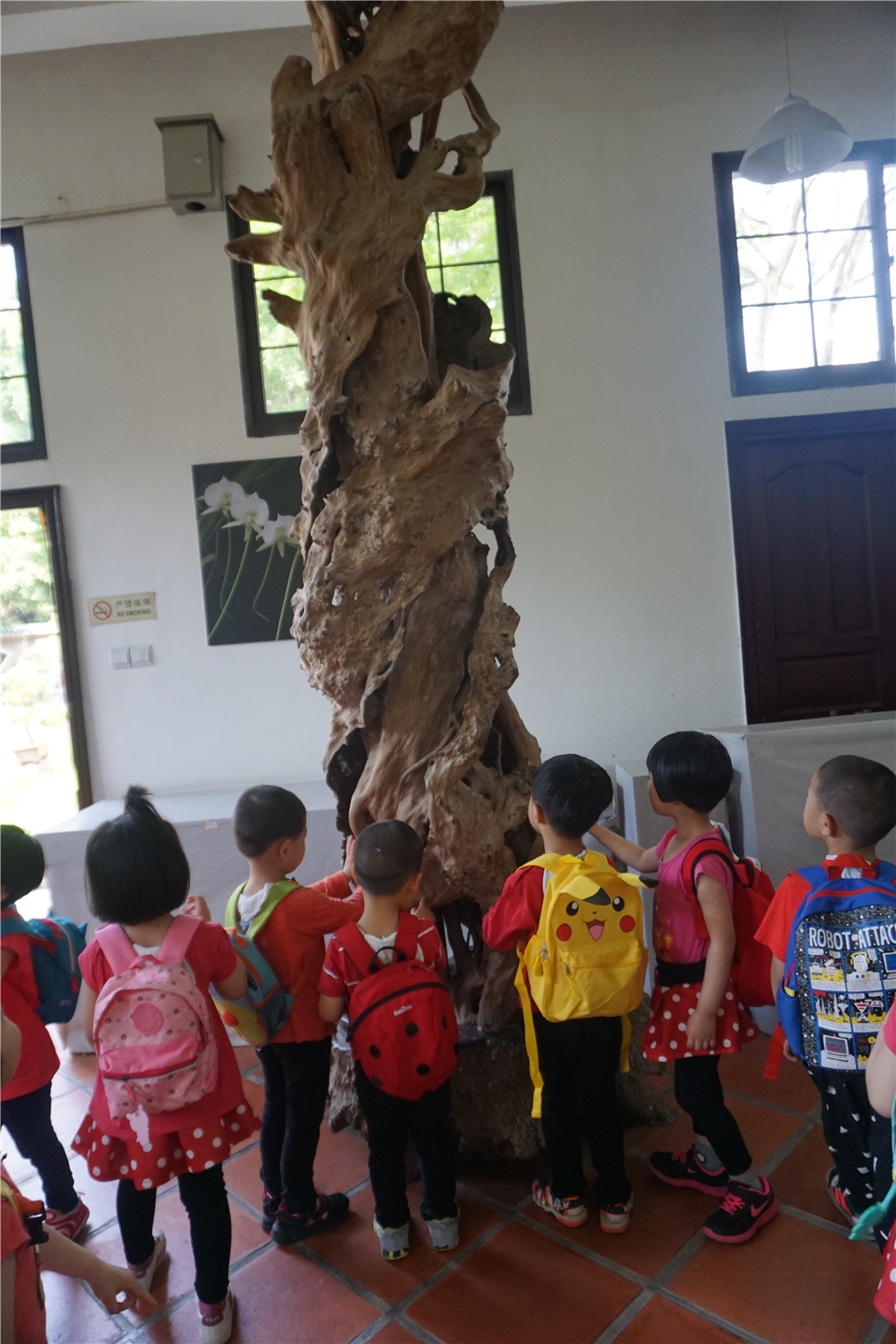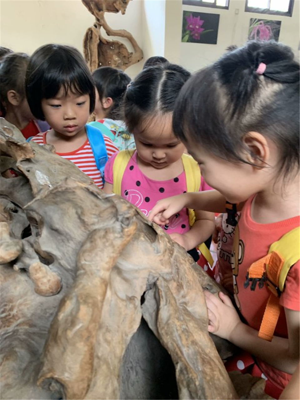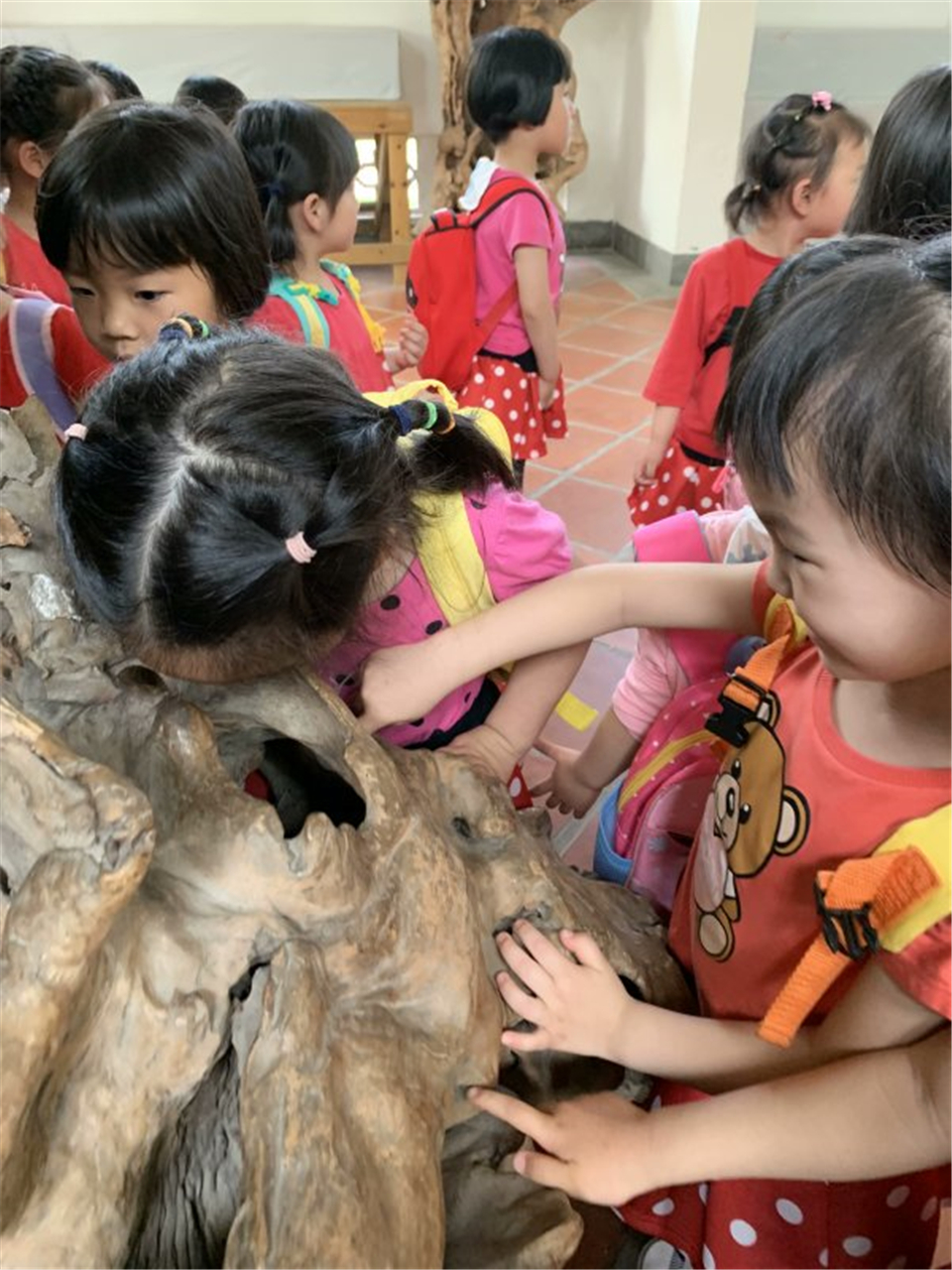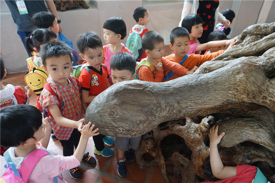 走呀走呀,老师带宝贝们进入公园一处神秘空间:“宝贝们,带你们看看神奇有趣的根雕哦,这里都是很多大树的根,厉害的园艺叔叔阿姨把他们变成了许多不同好玩的样子哦!”