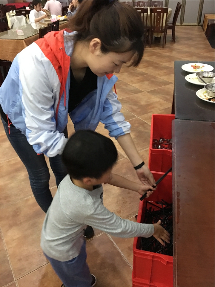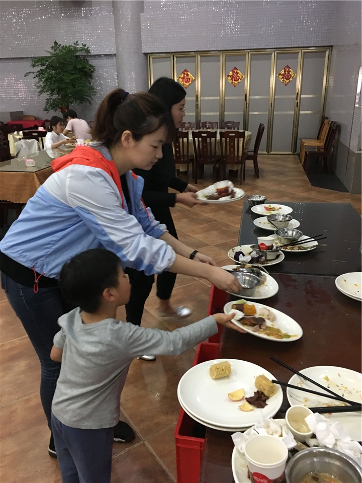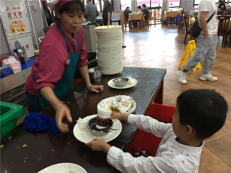 孩子们美美地享受完美食,留下空空的盘子,接下来要怎么办呢?这里没有服务员帮我们收拾哎!对了,刚刚老师介绍了餐具回收处。只见先吃完的孩子们拿着自己的餐具来到了碗筷输送带前,在服务员阿姨的指示下分类放好了,棒棒哒!
