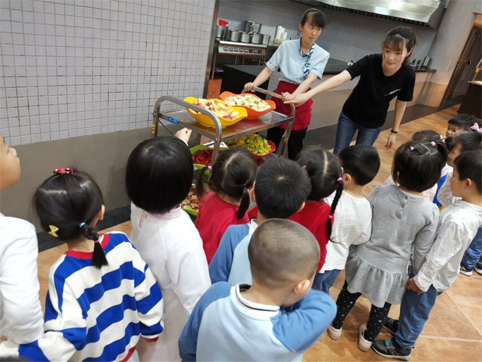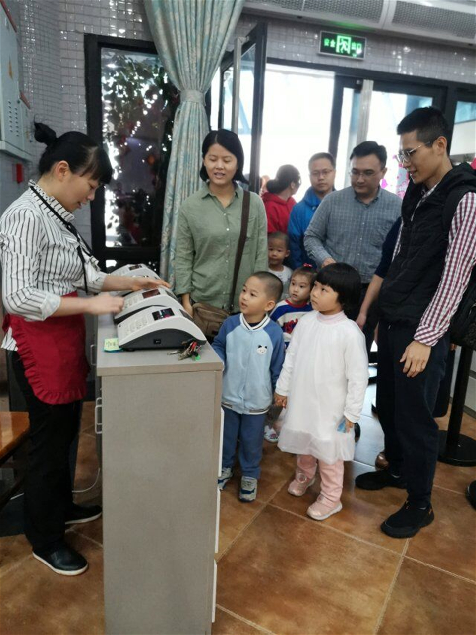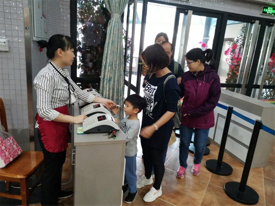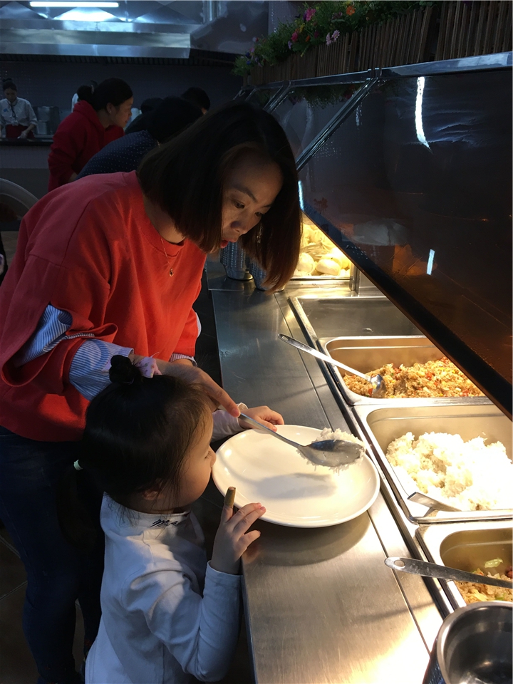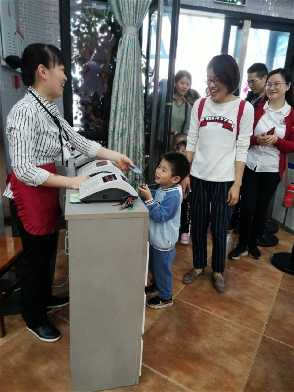 排队,刷卡......小朋友们用稚嫩的声音,热情地和工作人员打着招呼,还清楚地和工作人员说:“一个大人,一个小孩。”并递上爸爸或妈妈的教工卡进行刷卡。这波操作有没有很溜呢!