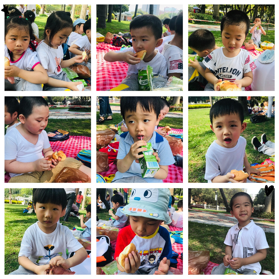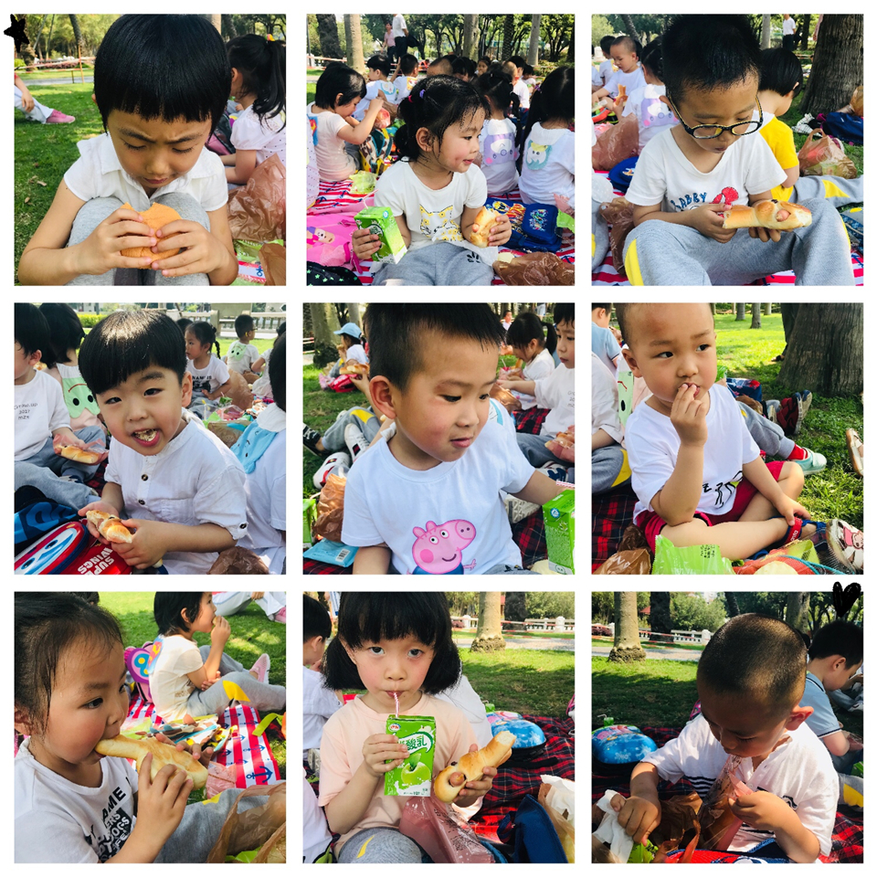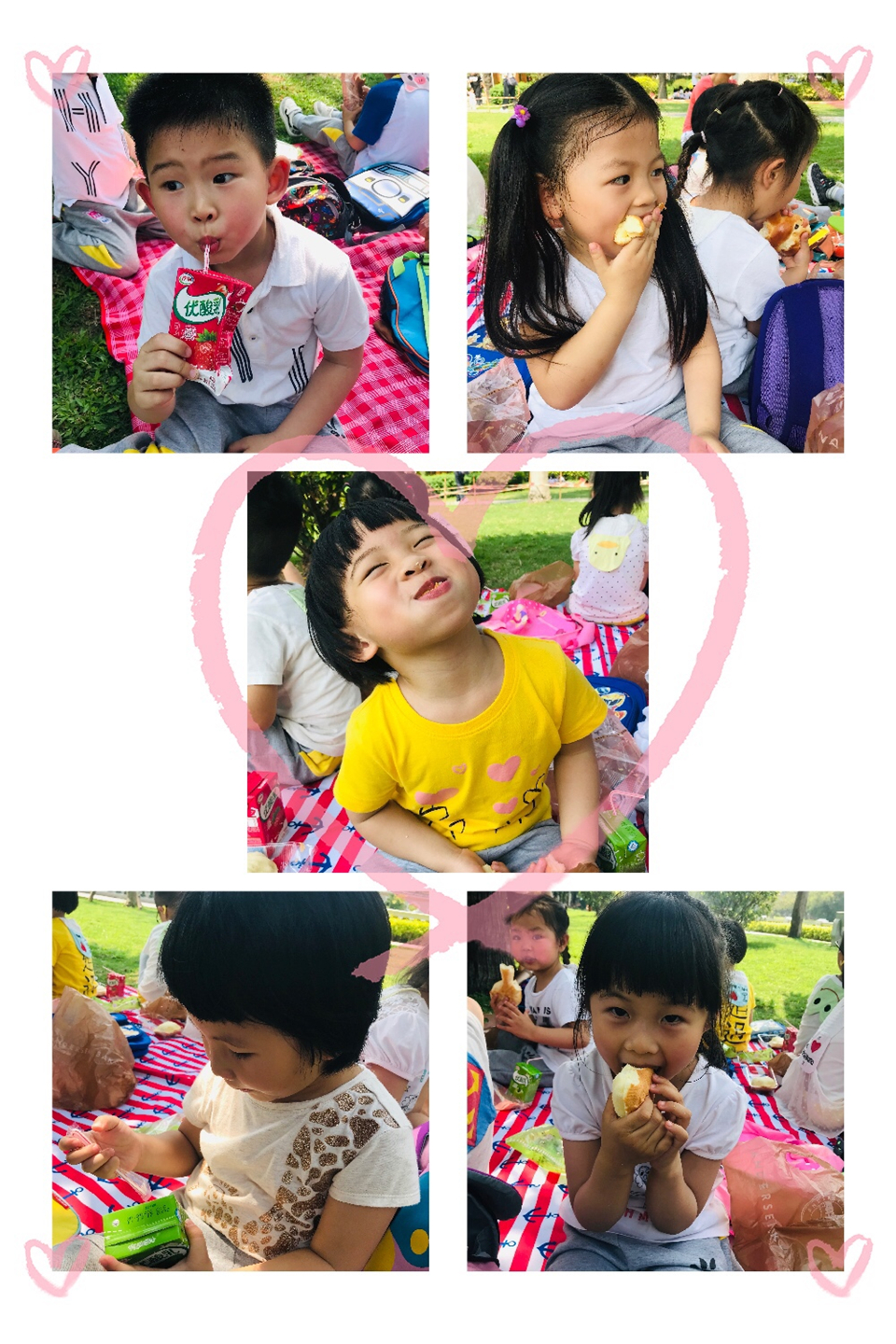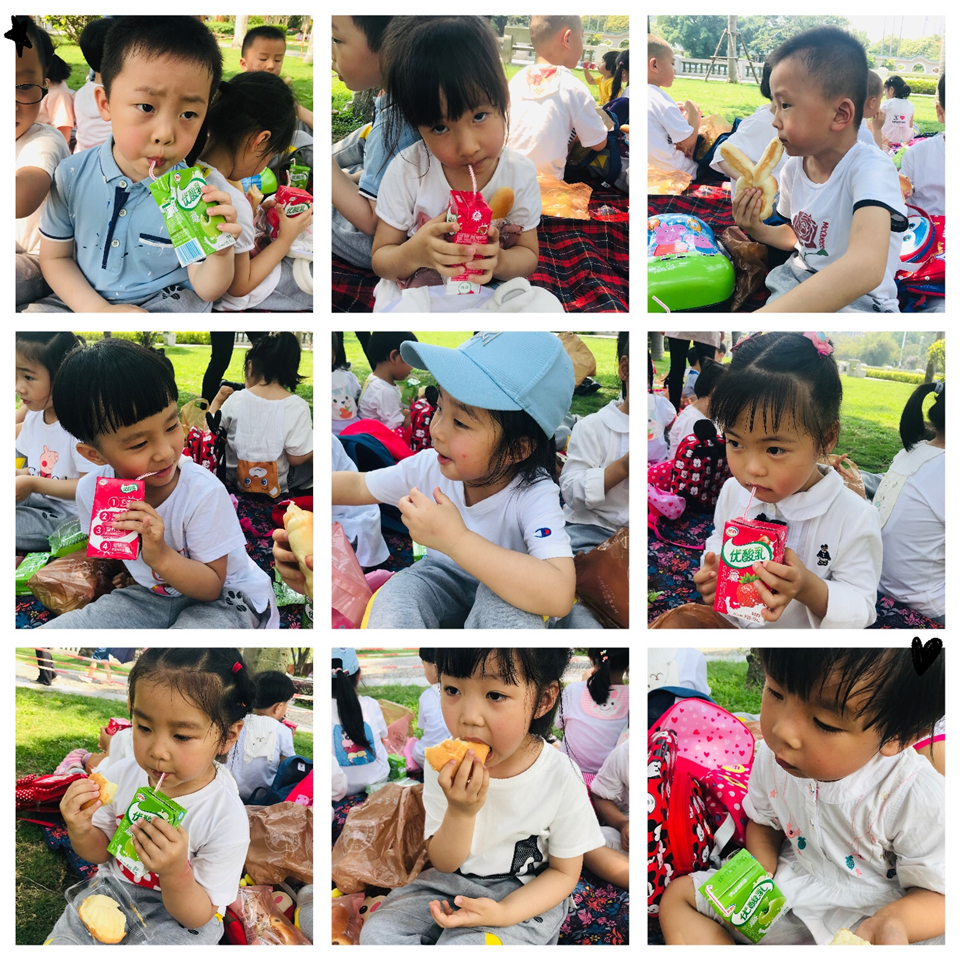玩累了休息一下吧,小朋友们从书包里拿出美味的蛋糕和饮料,大口大口的吃的真香呀!不一会就把东西都吃完了,细心的小朋友们还将垃圾丢在老师准备的垃圾袋里。