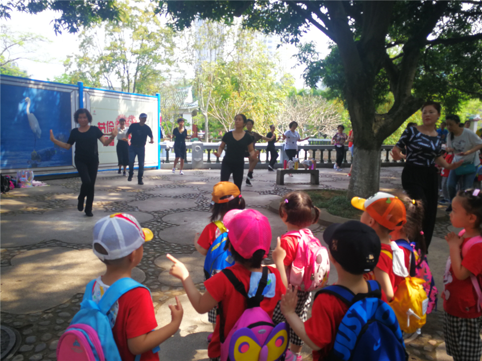 孩子们欣赏着四周的景色,一边走,一边与小伙伴谈论着自己的发现,寻找着春天的足迹。突然,一群活力四射的阿姨们,用她们优美的舞姿把孩子们的目光全部吸引过去了,还有的孩子们跟着她们一起扭扭屁股,伸伸胳膊呢,引得路人都为孩子们竖起了大拇指点赞呢!