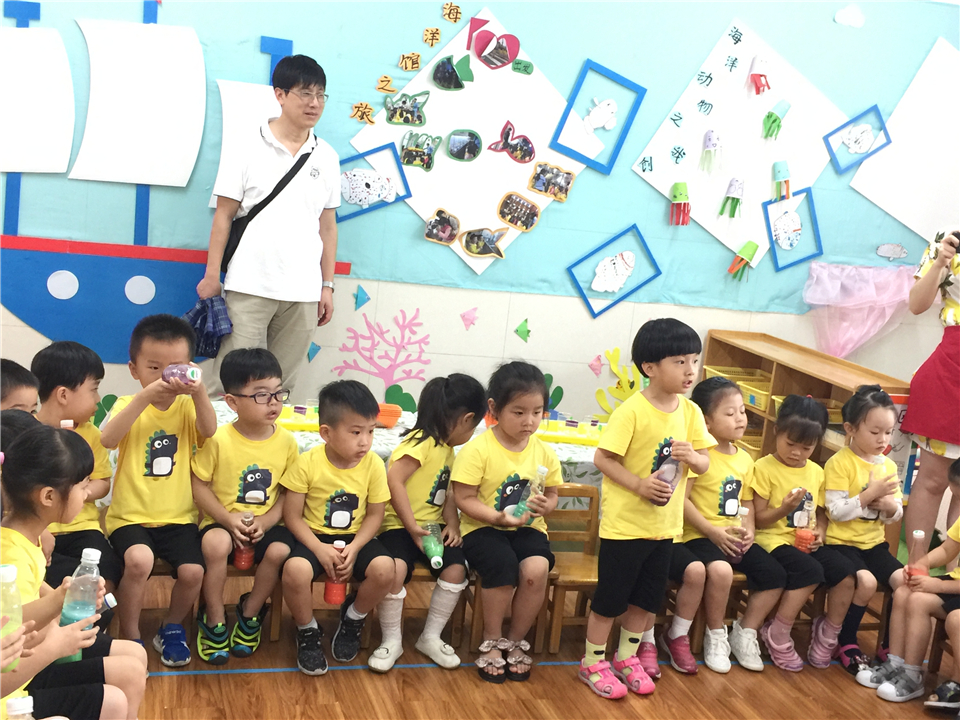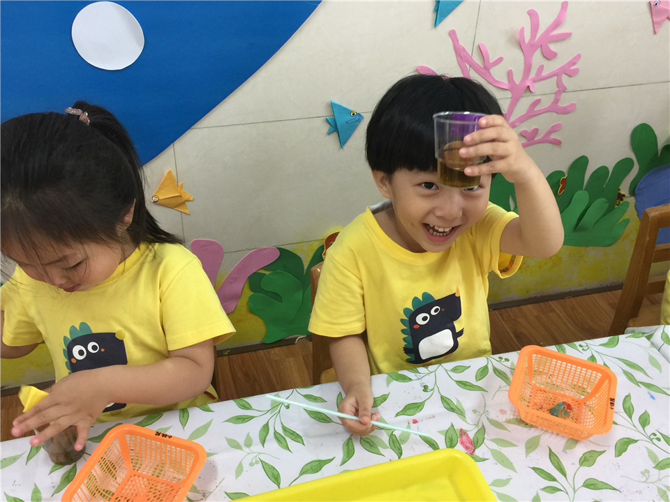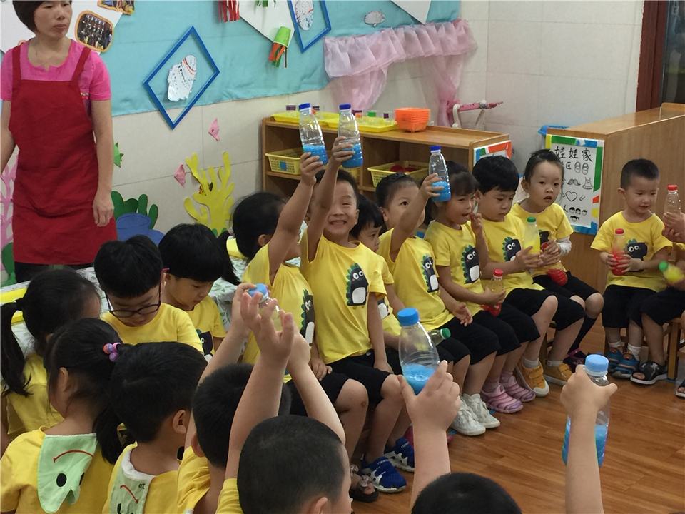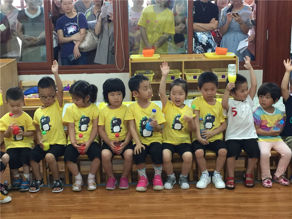 听了孩子们可爱的猜想,大魔法师决定邀请孩子们一起来施展魔法,于是小魔法师们找到自己的水瓶,开始跟随魔法师口念咒语、振振有词,随后有模有样地晃动了水瓶,成功变出颜色后。