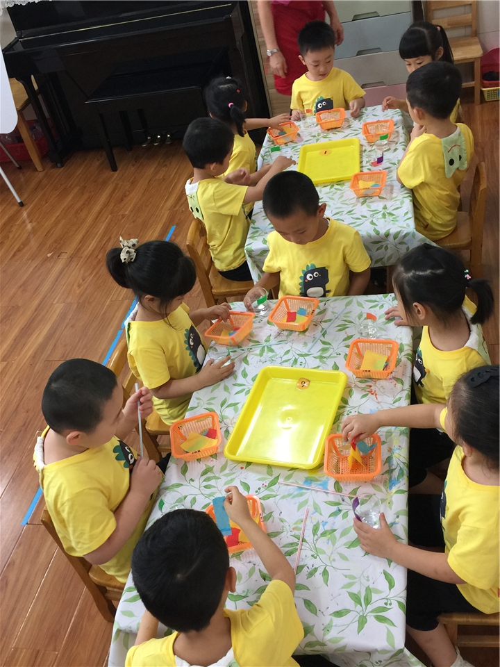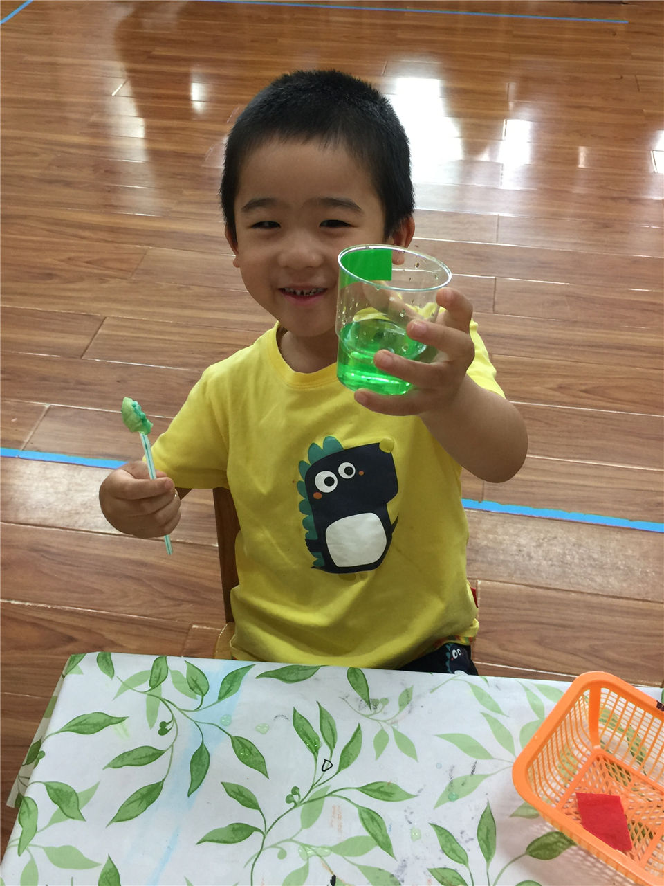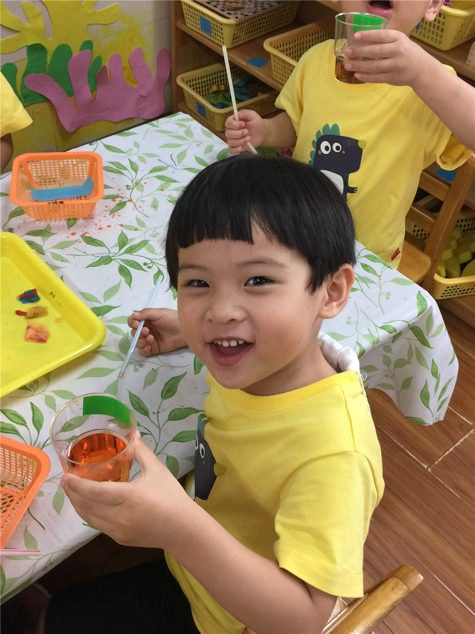 瞧,各就各位后,小魔法师们已经迫不及待地动起手来了,在他们灵巧的小手操作下,一个个瓶子瞬间再次“变身”,呈现出一个从来没有出现过得颜色。快让我们一起去看看小魔法师的魔术和揭秘现场吧!