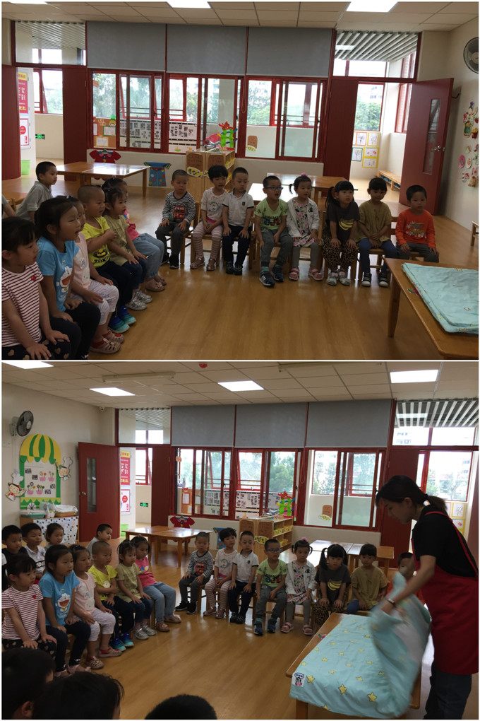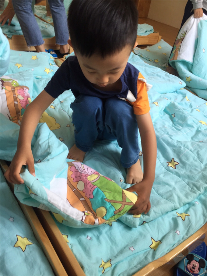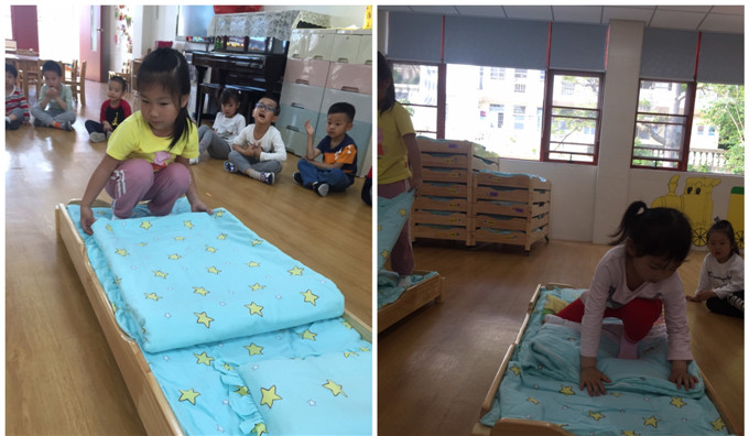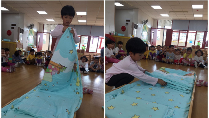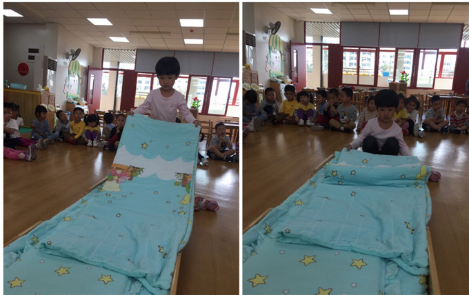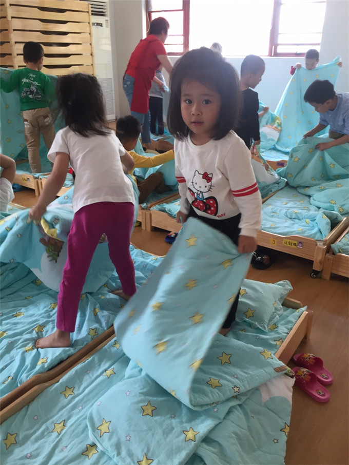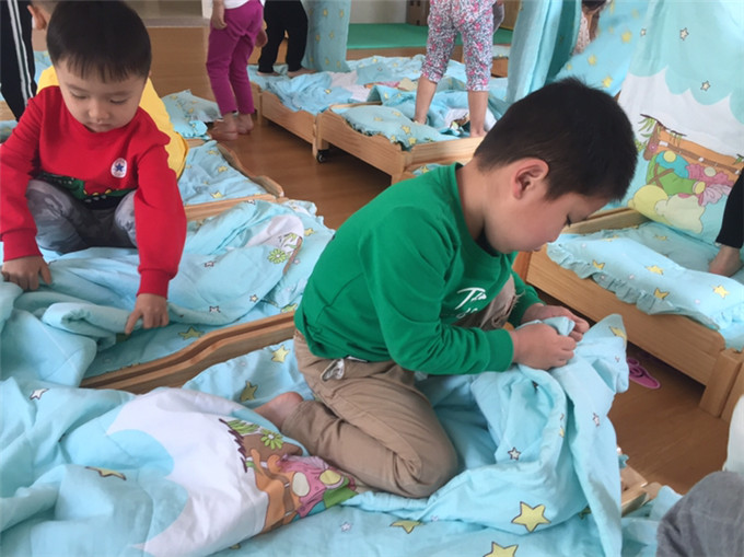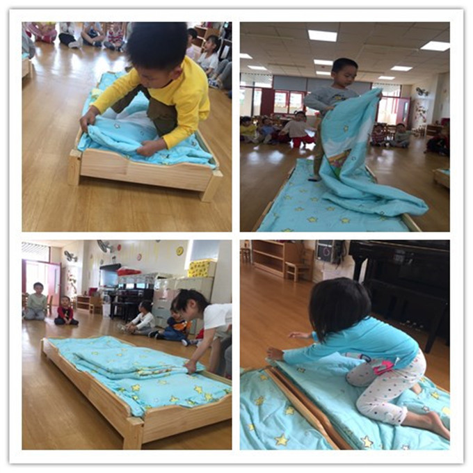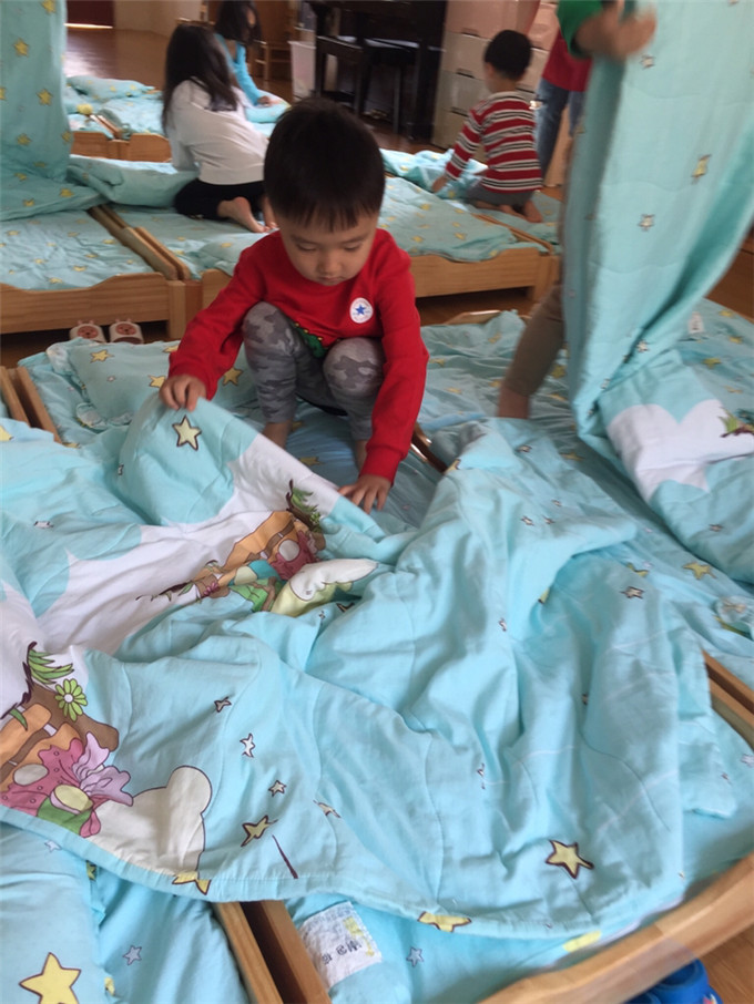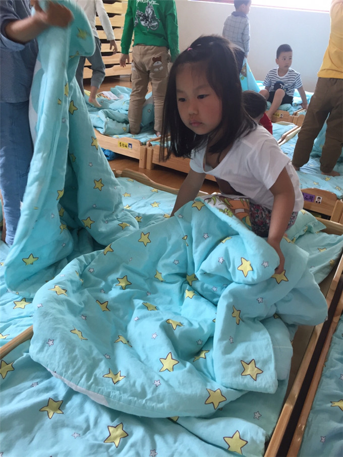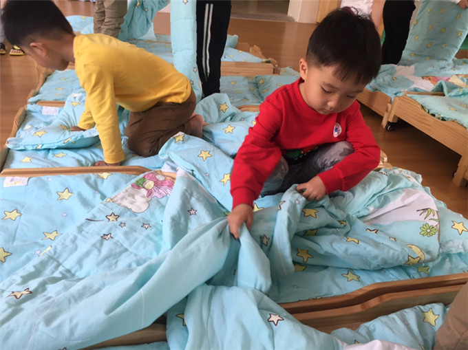 得到老师允许的小家伙们一窝蜂冲进卧室,开始手忙脚乱的叠被子工程。看,小家伙们像模像样地把被子角对角地对折。