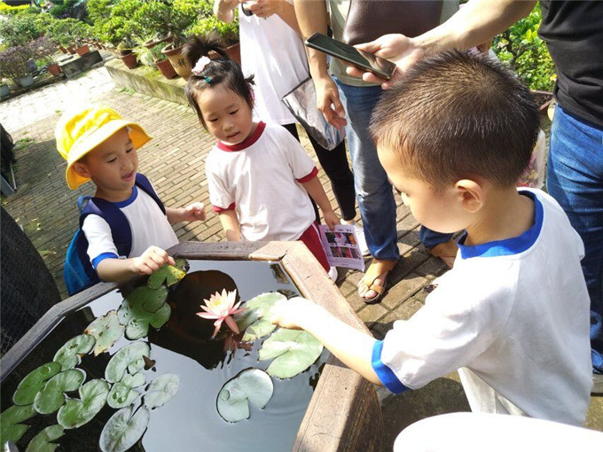 “哇!爸爸你看,那朵黄色的花好美呀。”“这朵花长在水里耶,好漂亮呀。”“我也很喜欢,可是它怎么不会被水淹死呢?”满园的花儿引起了孩子们的纷纷议论。