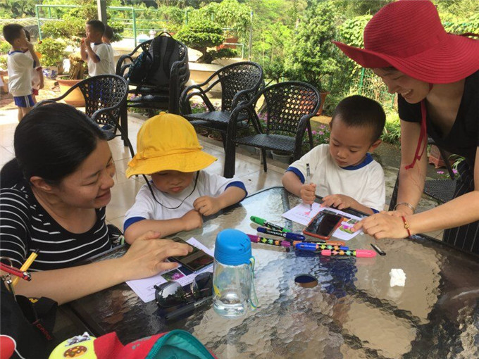 “妈妈、妈妈这朵花中间是红色的,花瓣是玫红色的,有点刺眼,真像太阳啊!”“宝贝,这朵花俗称就是太阳花呢!”孩子们爸爸妈妈的帮助下,通过颜色认识各种花儿。