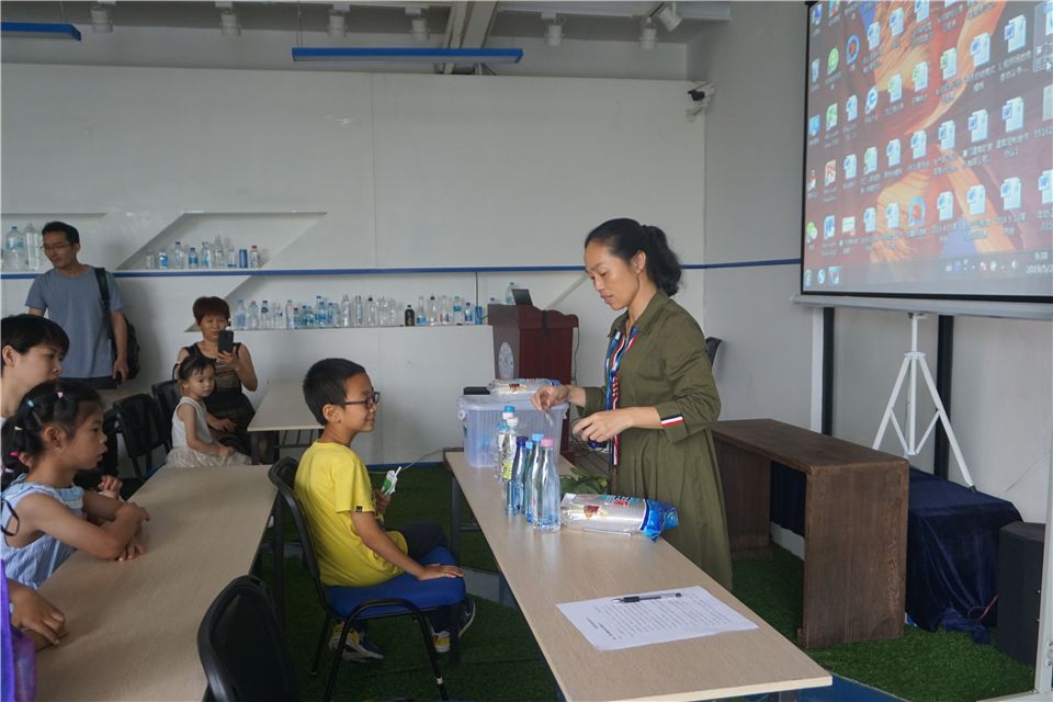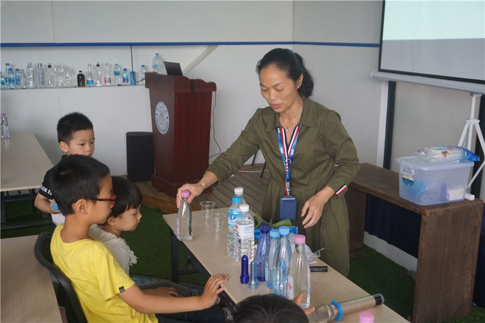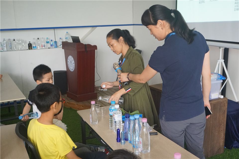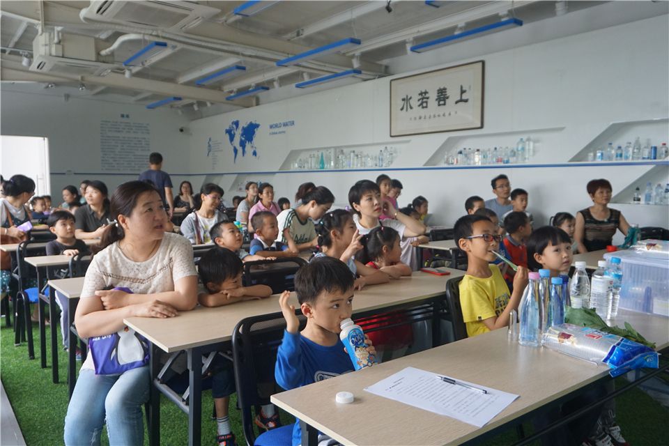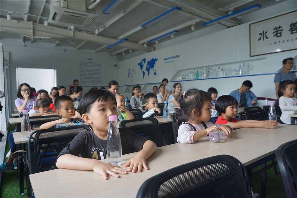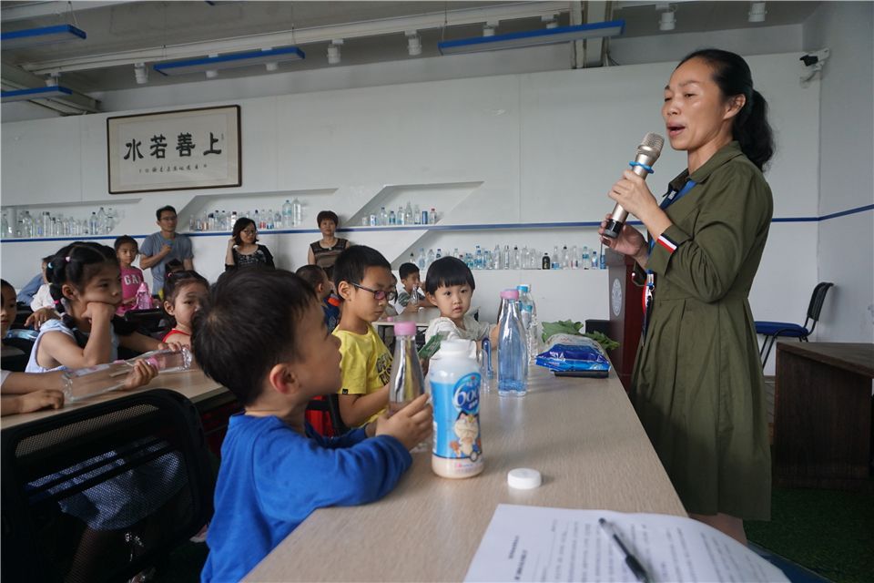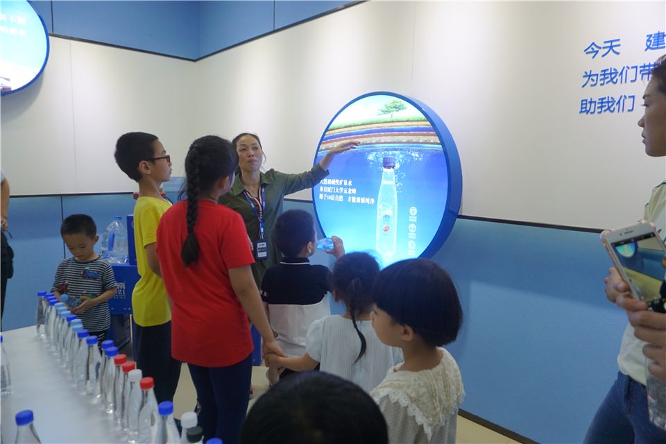 结束好玩的水实验,洪老师带领大家持续探索,进入水厂展厅。洪老师向大家介绍了水厂的发源以及如何运作,安全、卫生,展厅里摆放着一瓶瓶的厦大水厂自产的矿泉水哦,叔叔阿姨真了不起!