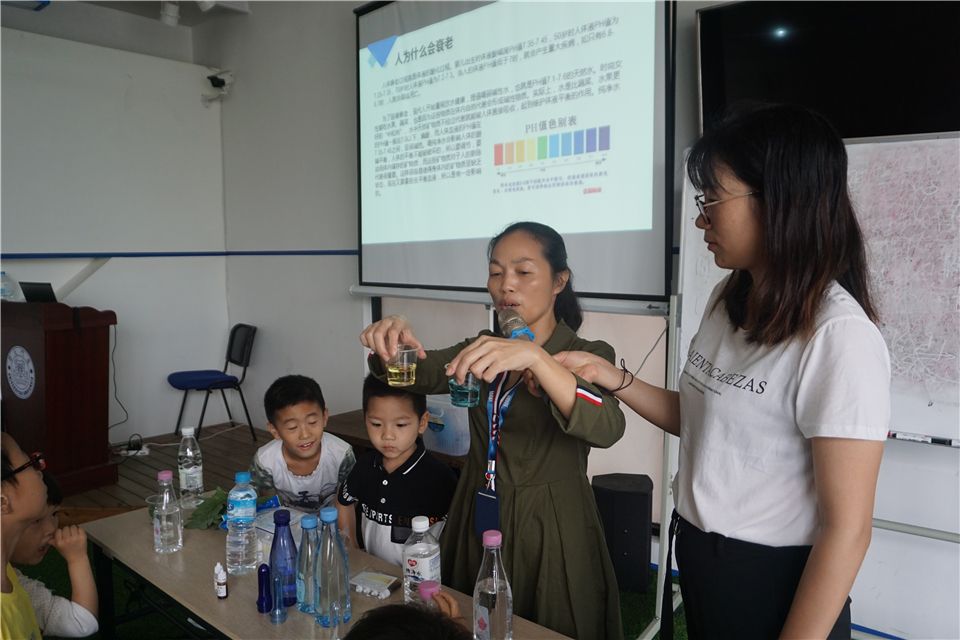 洪老师向大家解开谜底,原来呀,不同的水有不同的酸碱度,我们倒入试剂测量,如果偏蓝色就是碱性,如果偏黄色就是酸性。