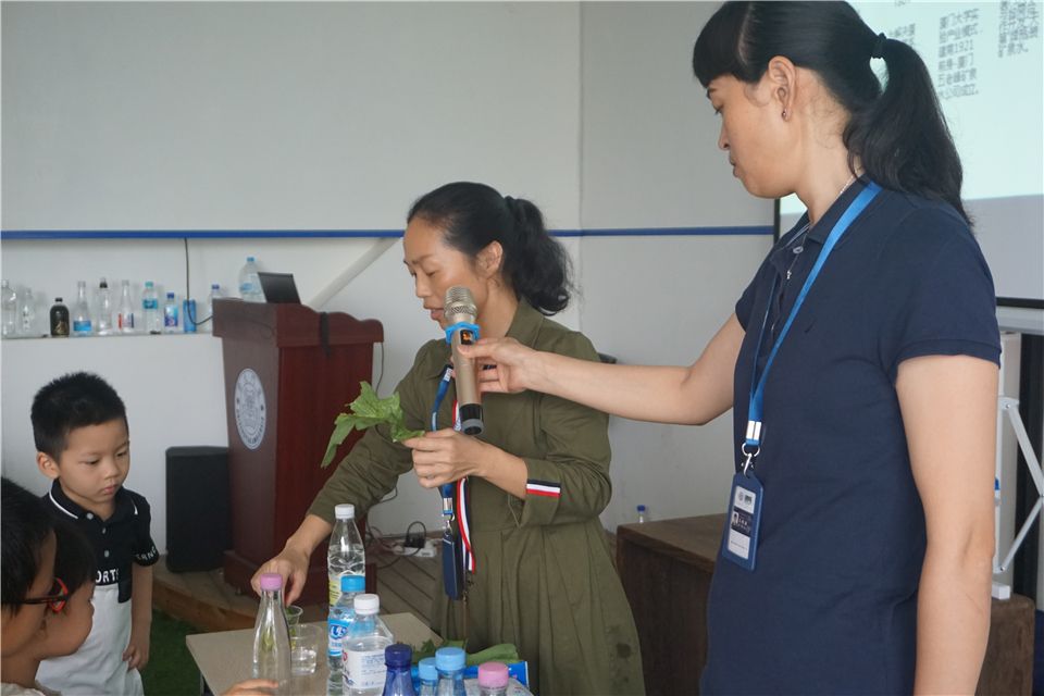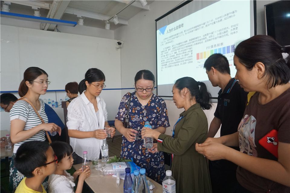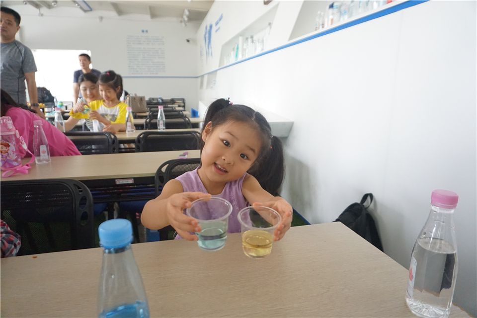 接下来的实验,洪老师邀请爸爸妈妈和小朋友们一同参与啦!洪老师介绍道:“每组家庭两个杯子,一杯装着我们厦大水厂的矿泉水,一杯装普通市面的纯净水,还有一支试剂,将试剂倒入两个杯子中,大家看看有什么神奇的现象哦!”