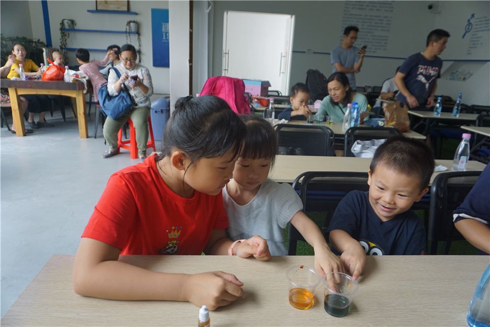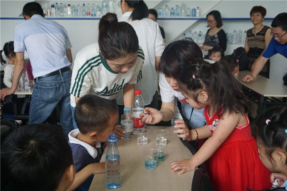 于是,爸爸妈妈们帮宝贝们倒好水,将试剂递给宝贝们自己倒。