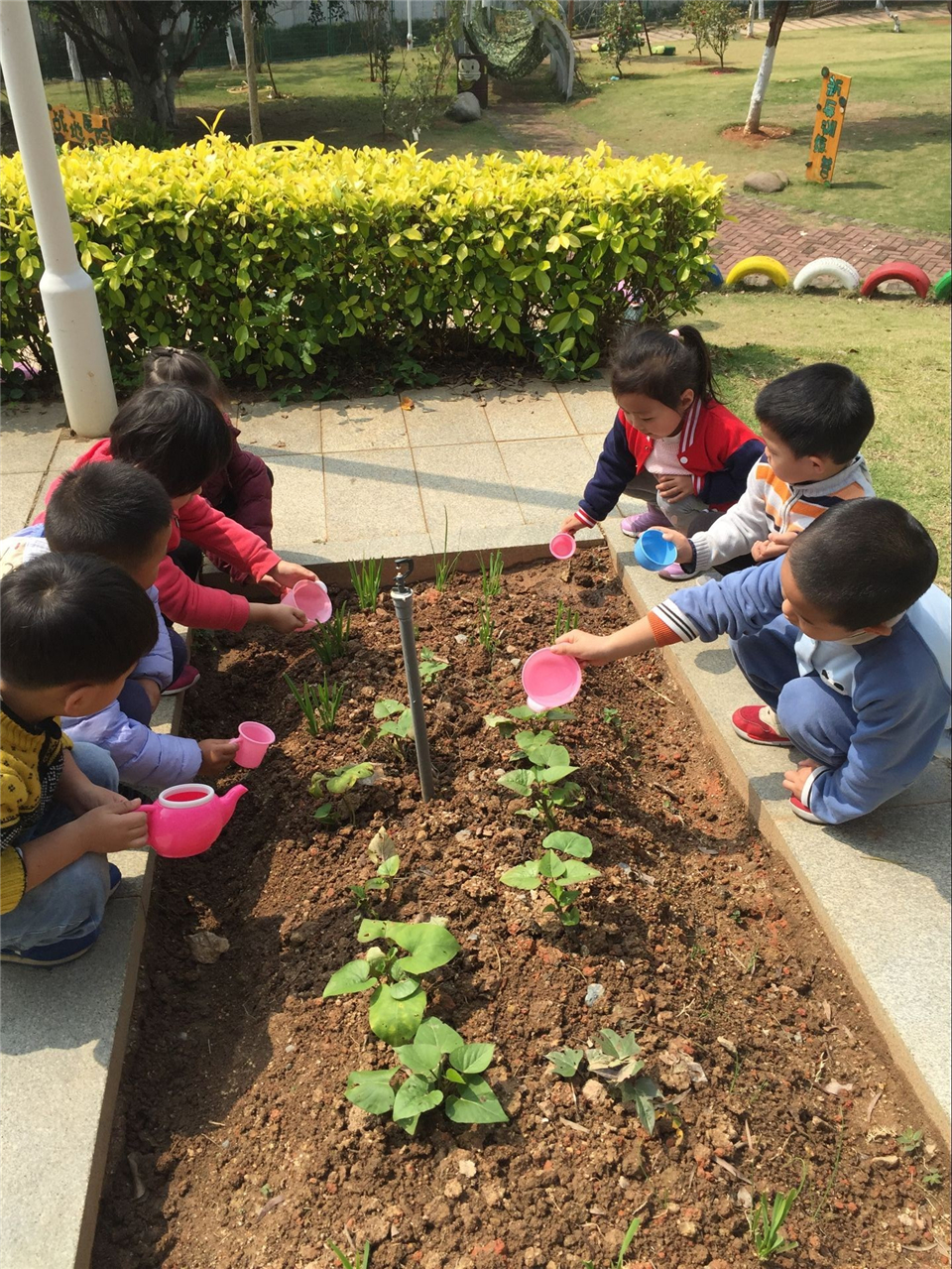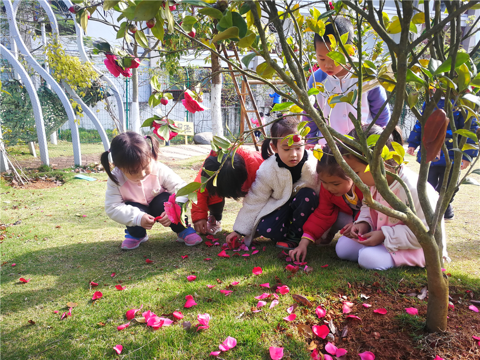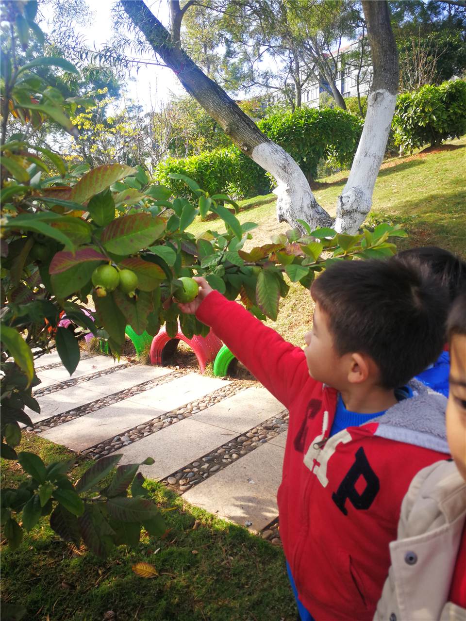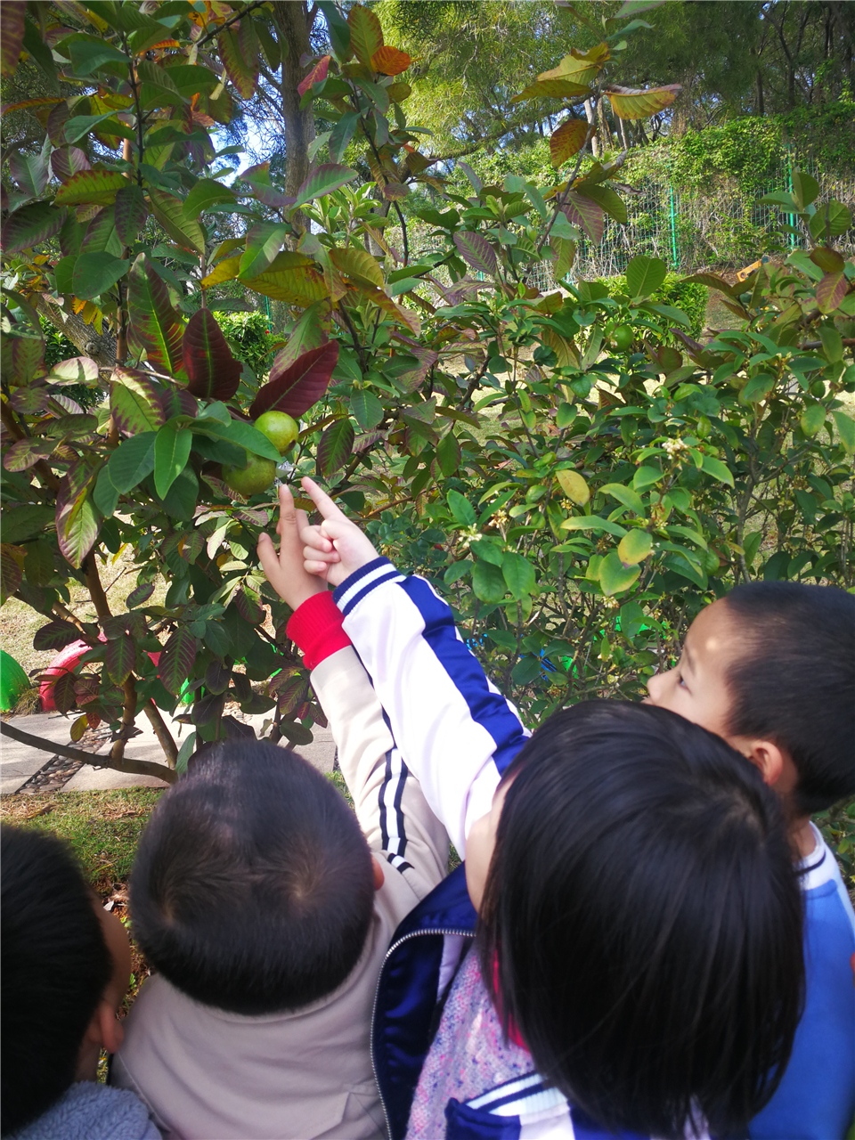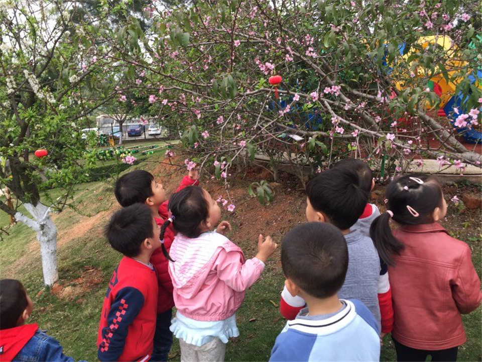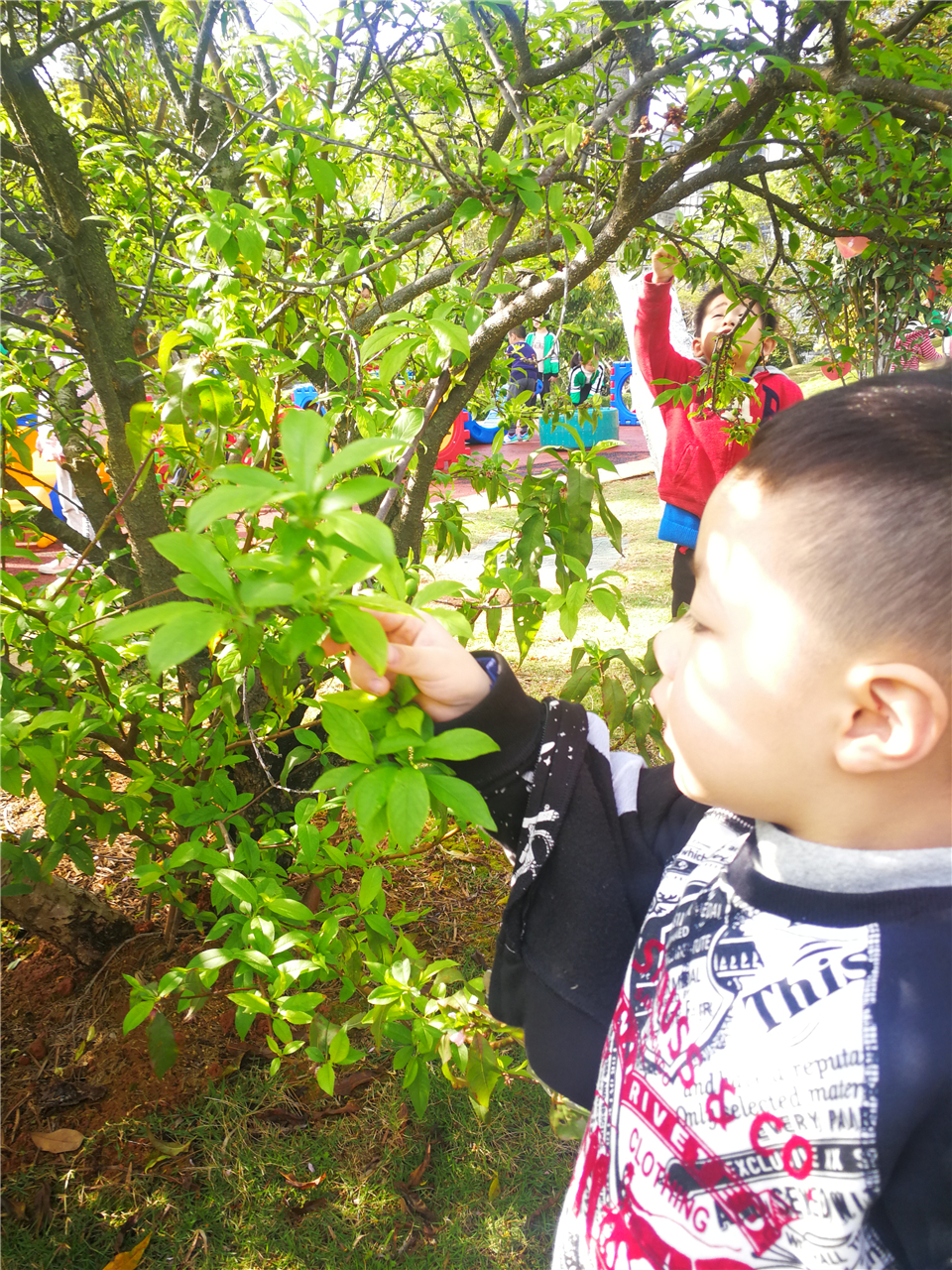 一走到小山坡,小朋友就发现桃树上的小桃花不见了,变成了一个个小小的桃子,小朋友兴奋地围着桃树数着树上到底结了几个桃子了。走近花丛,大家发现每一朵小花差不多都有五片花瓣儿,中间的花蕊是金灿灿的,轻轻一碰会沾得你满手都是金黄的花粉。