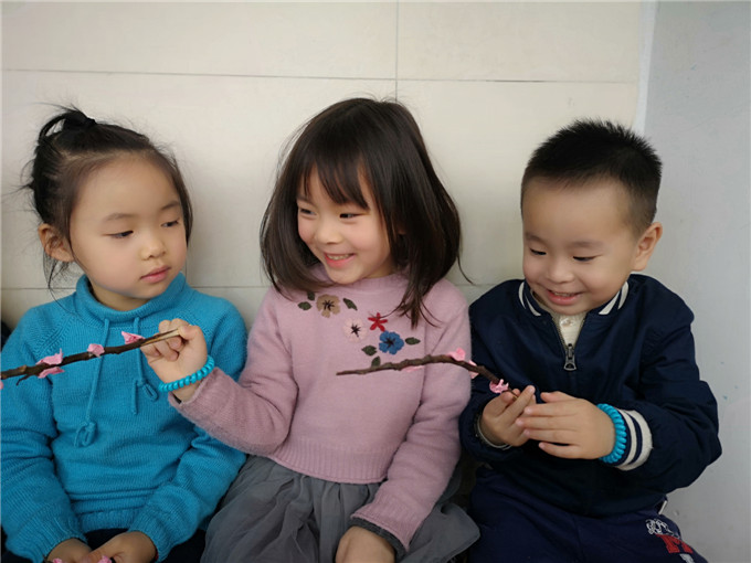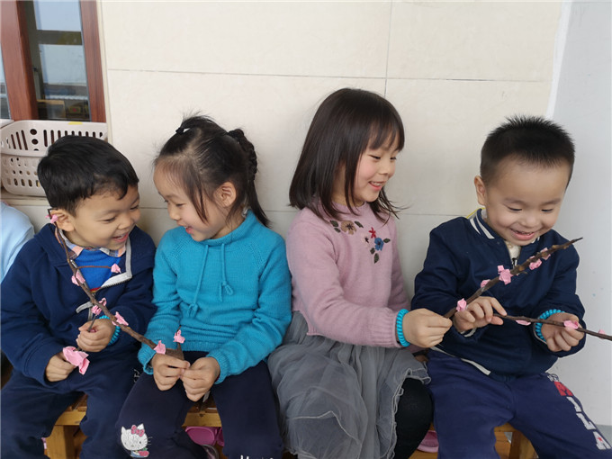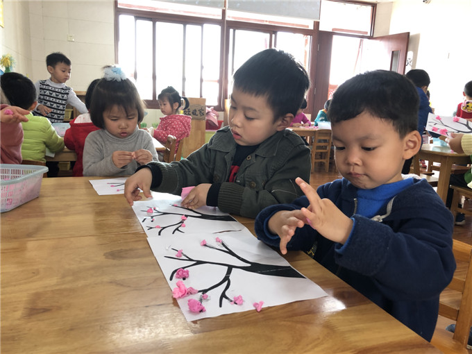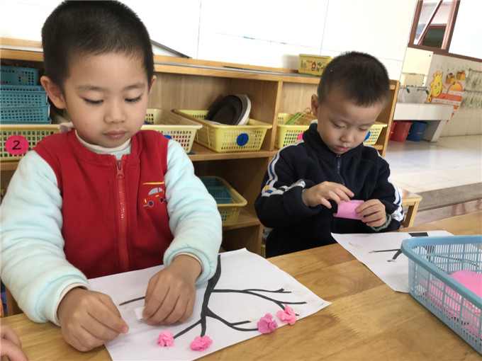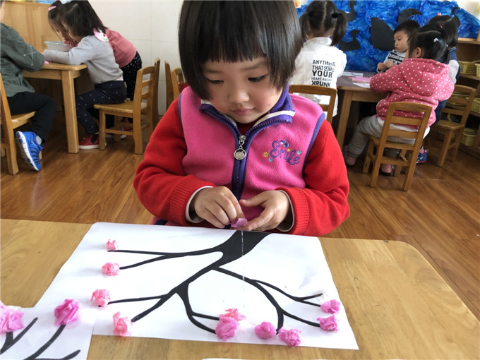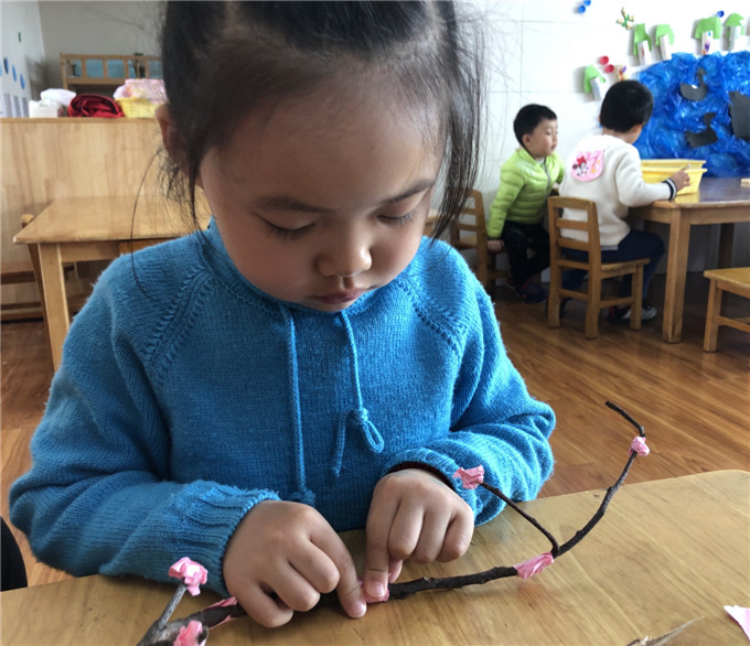 瞧!我们都有一双会创造、灵巧的小手。有的揉、有的搓、有的撕,再搭上小小的树枝,嘻嘻……朵朵美丽的桃花盛开啦,漂亮极了!